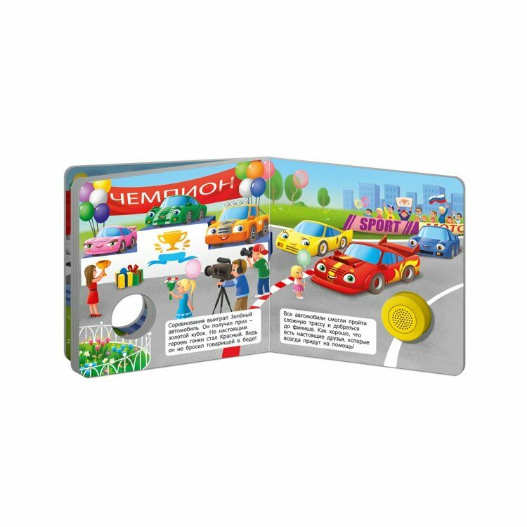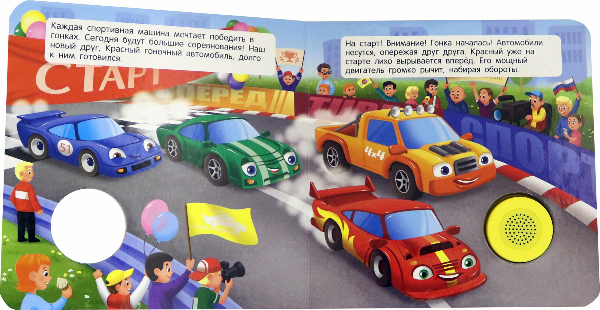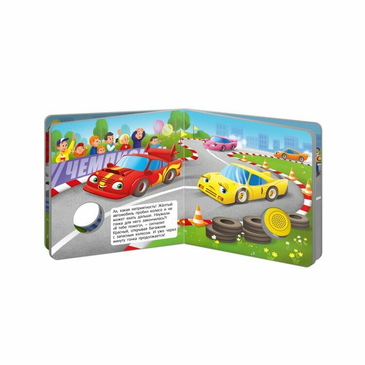 Звуковая книга "Гоночная машинка" для самых маленьких читателей. В каждой книге серии своя забавная и поучительная история, яркие картинки с изображением веселых и добрых героев и музыкальный модуль с голосом главного героя. Это отличный способ познакомить ребенка с окружающим миром и увлечь его чтением. Малыш будет с удовольствием рассматривать яркие страницы и читать историю главных героев книги. Книжка сделана из плотного картона с глянцевой ламинацией, поэтому родители могут не опасаться, что ребёнок порвёт странички. Благодаря компактному формату (15,5х15,5 см) её удобно брать с собой в дорогу. Книжка укомплектована батарейками. Одна кнопка - один звук.