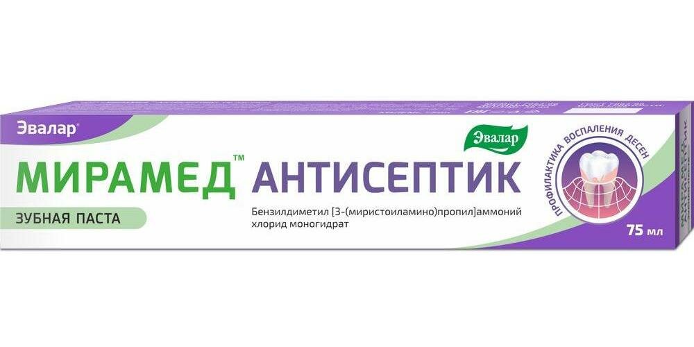 Мирамед – первая1 зубная паста, содержащая самый популярный антисептик (бензилдиметил[3-(миристоиламино)пропил]аммоний хлорид моногидрат). Этот антисептик обладает широким спектром противомикробной активности, что позволяет эффективно бороться с бактериями, грибками и вирусами, поражающими слизистую оболочку. Благодаря этому, он успешно применяется для лечения и профилактики инфекционно-воспалительных заболеваний полости рта таких как: стоматиты, гингивиты, пародонтиты, переодонтиты и др. Доказано, что этот уникальный антисептик быстро купирует воспалительные процессы и ликвидирует болевой синдром в кратчайшие сроки, а также оказывает выраженный терапевтический эффект в составе зубной пасты: активно воздействует на микрофлору очага заболевания, снижает воспаление и кровоточивость десен, повышает местные защитные реакции и стимулирует регенераторные процессы в тканях и слизистых оболочках полости рта. Так, при герпетическом стоматите отмечалось значительное снижение чистоты осложнений и улучшение гигиенического состояния полости рта, в том числе у детей2. А при афтозном стоматите наблюдалось полное исчезновение клинических проявлений заболевания в полости рта, а также исчезновение болевых ощущений уже на 3-4 день после начатого лечения3. Зубная паста Мирамед объединила в себе все вышеперечисленные свойства уникального антисептика с традиционным действием зубных паст: защита от кариеса и заболеваний пародонта, снижение кровоточивости десен, укрепление и восстановление зубной эмали, уменьшение зубного камня, очищение полости рта, снижение чувствительности зубов. Замените свою обычную пасту на зубную пасту Мирамед! Она не только поможет сохранить здоровье зубов и полости рта, но и обеспечит надежную защиту от вирусов в период ОРВИ и гриппа!