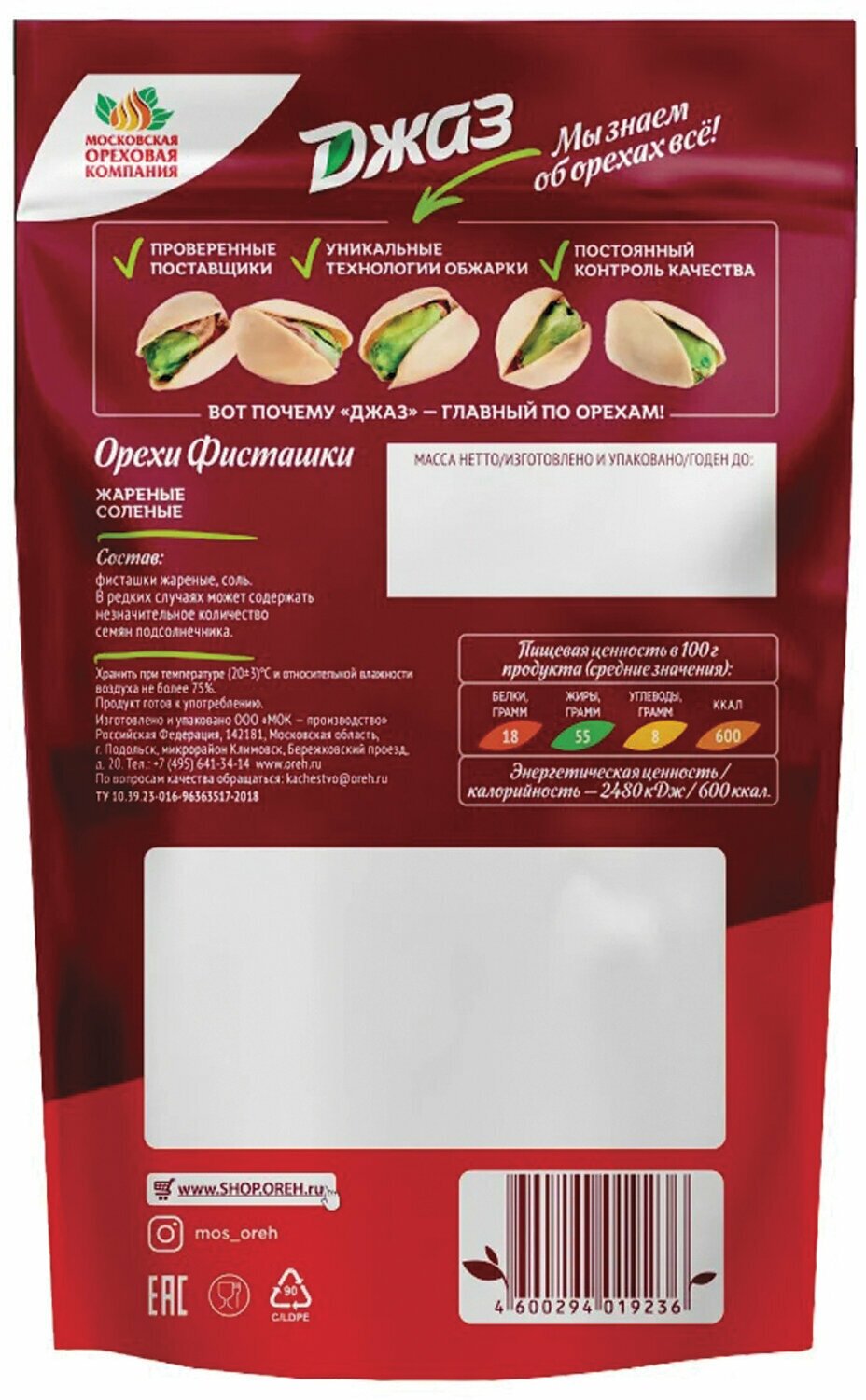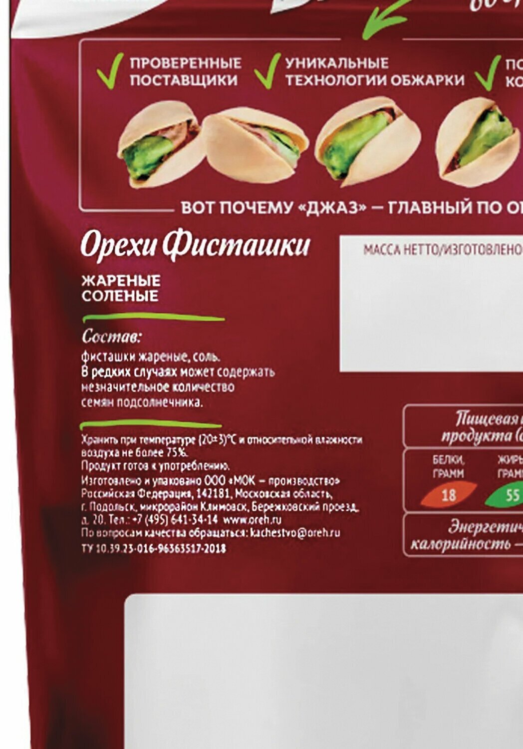 Состав товара:Фисташки жареные, соль.Меры предосторожности:В редких случаях может содержать незначительное количество семян подсолнечника. Хранить при относительной влажности воздуха не более 75%. ТУ 10.39.23-016-96363517-2018.