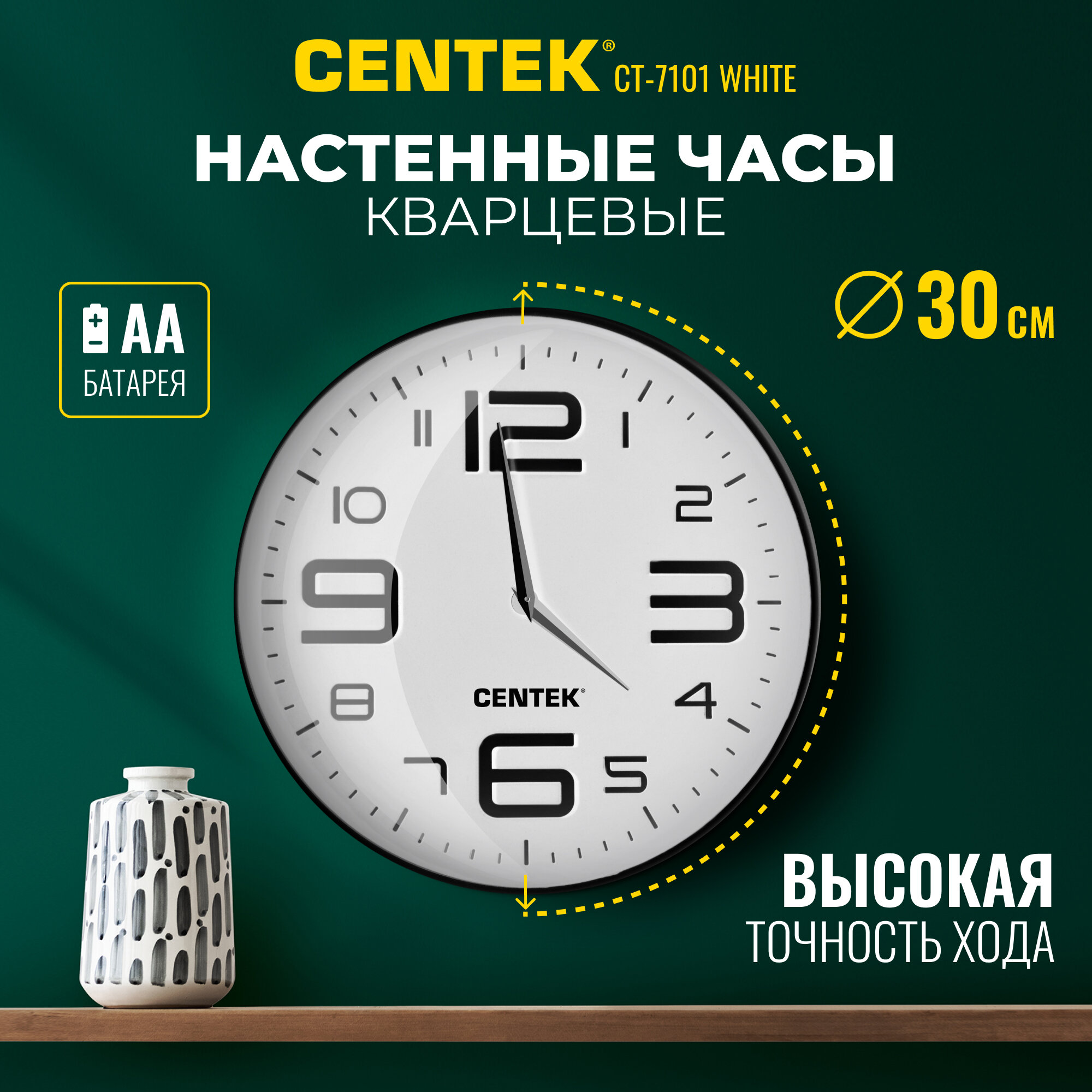 Часы настенные Centek СТ-7101 с объемными цифрами станут настоящим украшением и дополнением вашего интерьера. Модель можно разместить в гостиной, спальне или в офисе. Интересный дизайн и использованная цветовая гамма изделия придадут любому помещению уют и гармонию. Часы диаметром 30 см обладают пластиковым корпусом, большими хорошо читаемыми цифрами, отличаются простой и понятной настройкой. В часах установлен колебательный кварцевый механизм, обеспечивающий высокую точность хода. Предусмотрен плавный ход секундной стрелки. За ход времени отвечает одна батарейка типа AA (не входит в комплект).