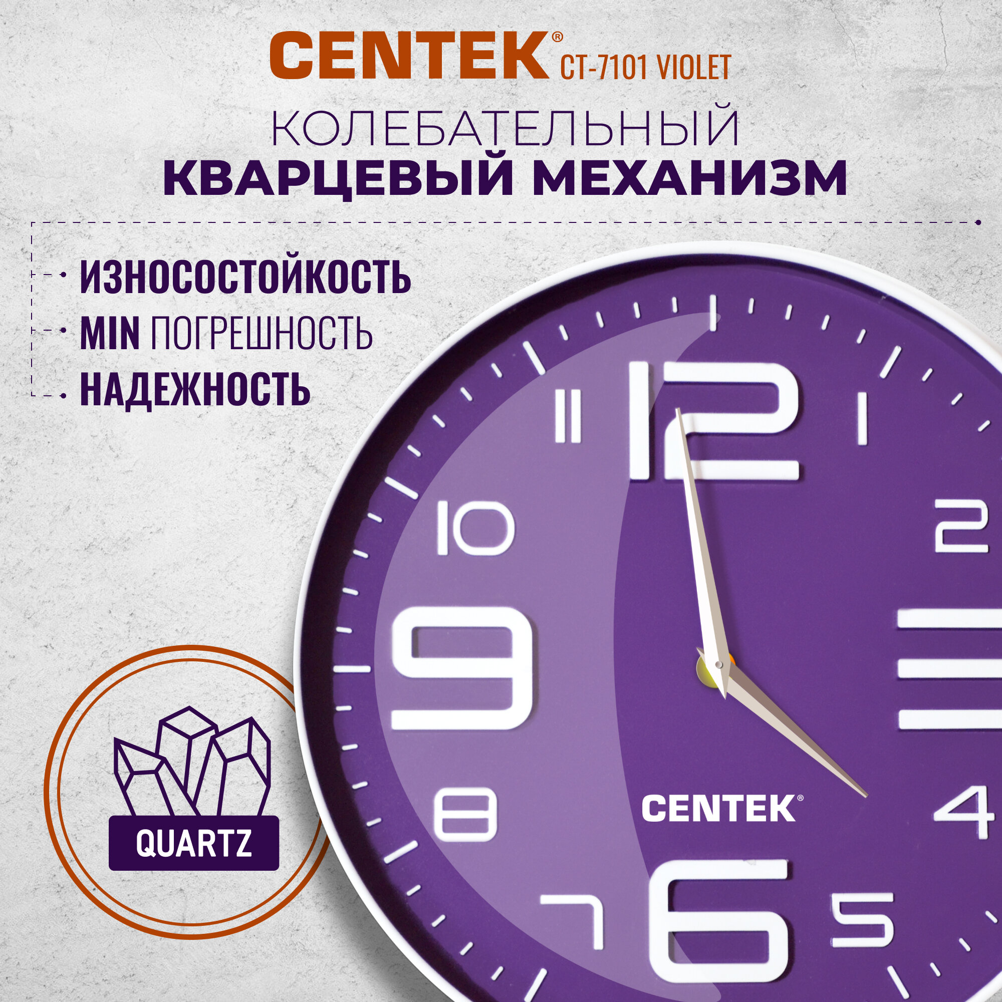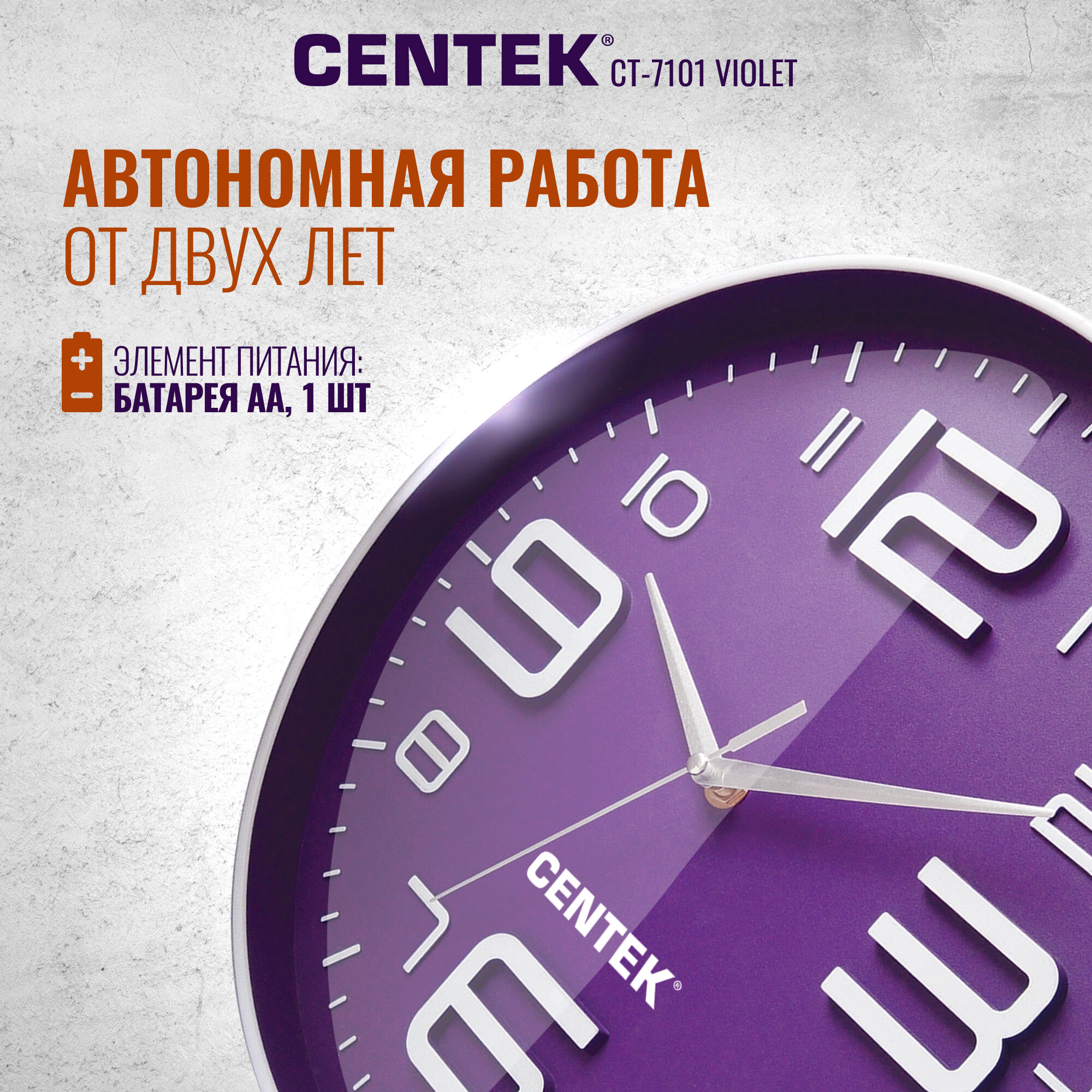 Часы настенные Centek СТ-7101 с объемными цифрами станут настоящим украшением и дополнением вашего интерьера. Модель можно разместить в гостиной, спальне или в офисе. Интересный дизайн и использованная цветовая гамма изделия придадут любому помещению уют и гармонию. Часы диаметром 30 см обладают пластиковым корпусом, большими хорошо читаемыми цифрами, отличаются простой и понятной настройкой. В часах установлен колебательный кварцевый механизм, обеспечивающий высокую точность хода. Предусмотрен плавный ход секундной стрелки. За ход времени отвечает одна батарейка типа AA (не входит в комплект).