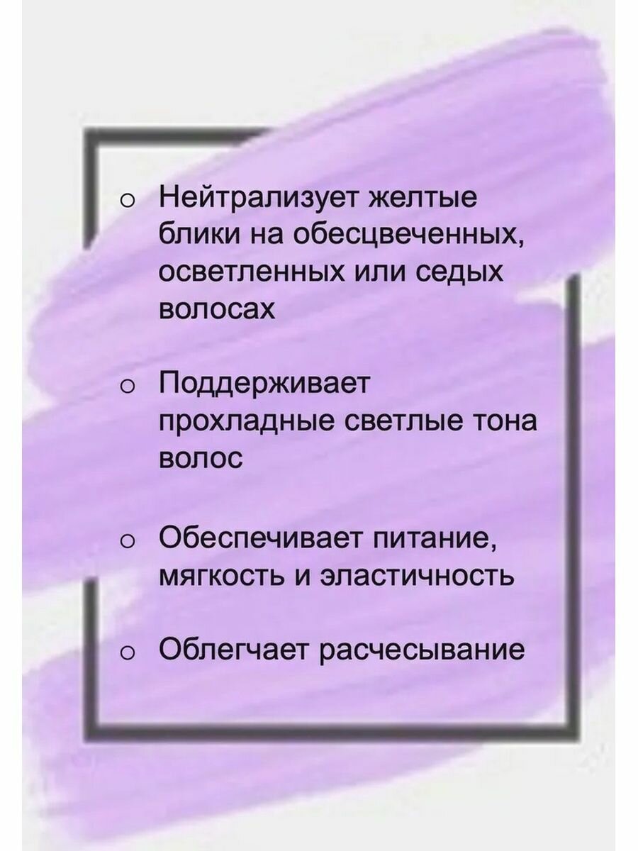 Способ применения: После применения Антижелтого шампуня для волос нанести на влажные волосы, осторожно помассировать, оставить на 2 минуты и ополоснуть.