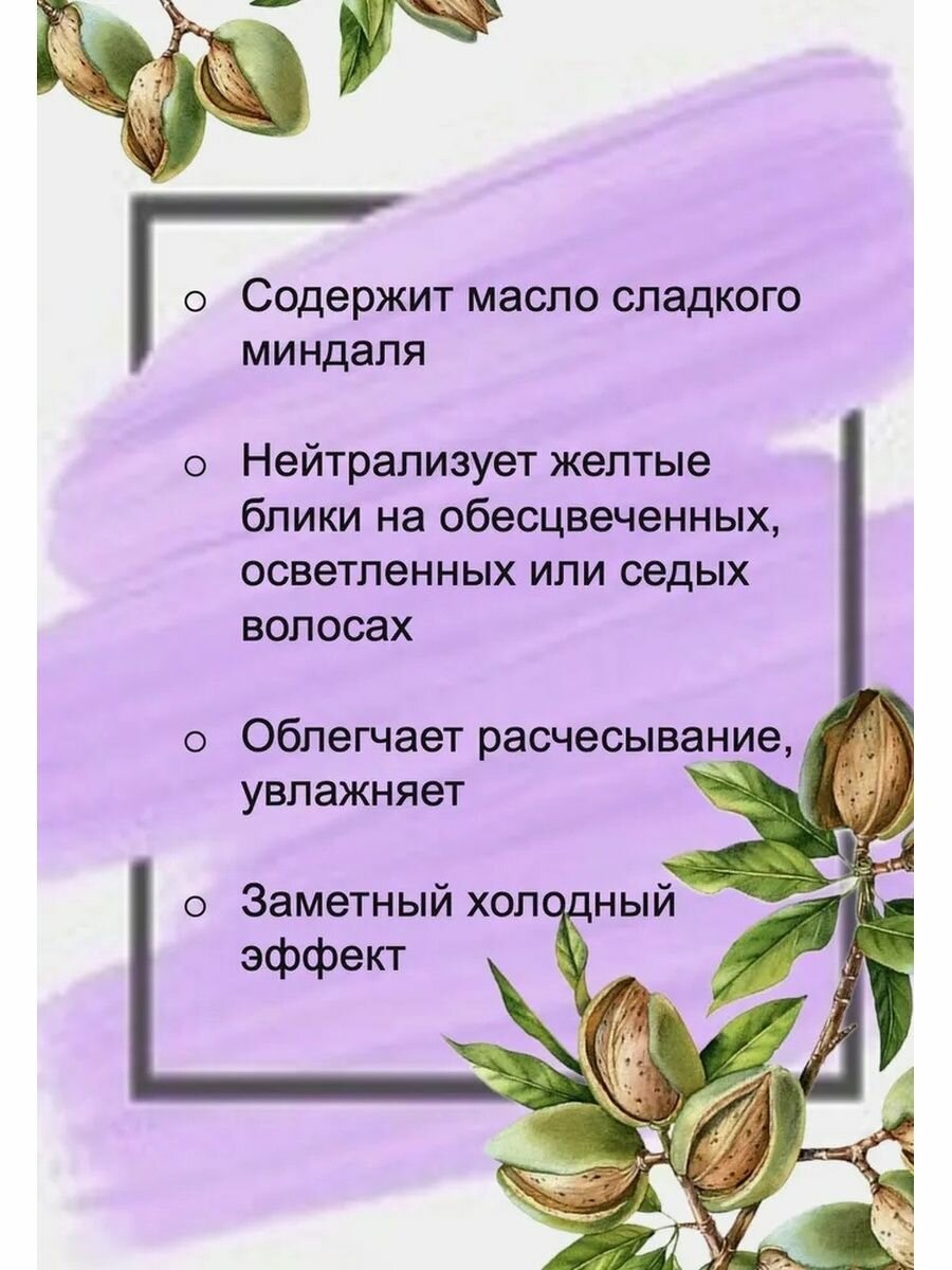 Обогащенный маслом сладкого миндаля и пигментом, является идеальным союзником для обесцвеченных, осветленных или седых волос. Он нейтрализует желтые блики на светлых волосах, обеспечивая увлажнение, распутывание и заметный холодный эффект.