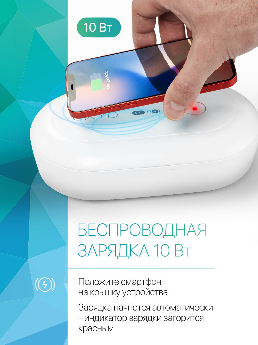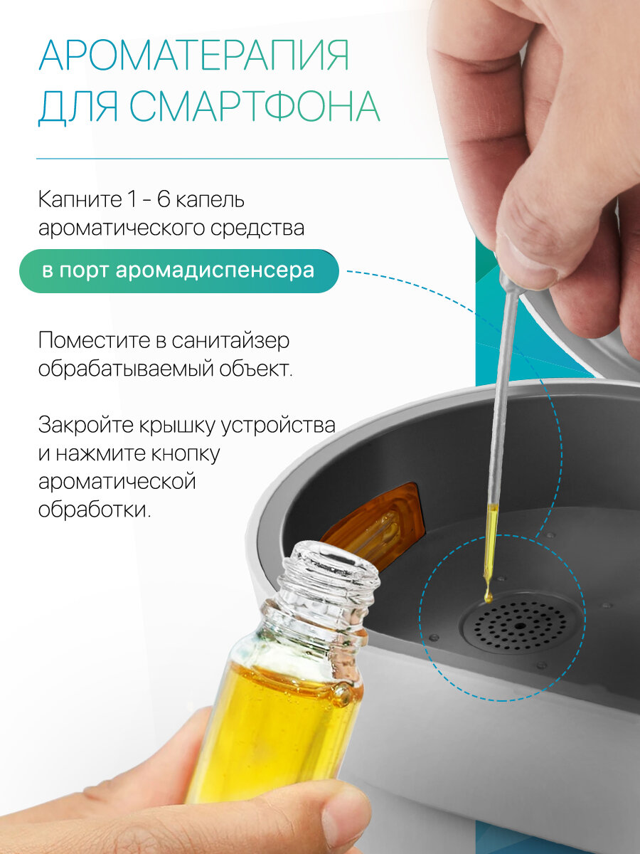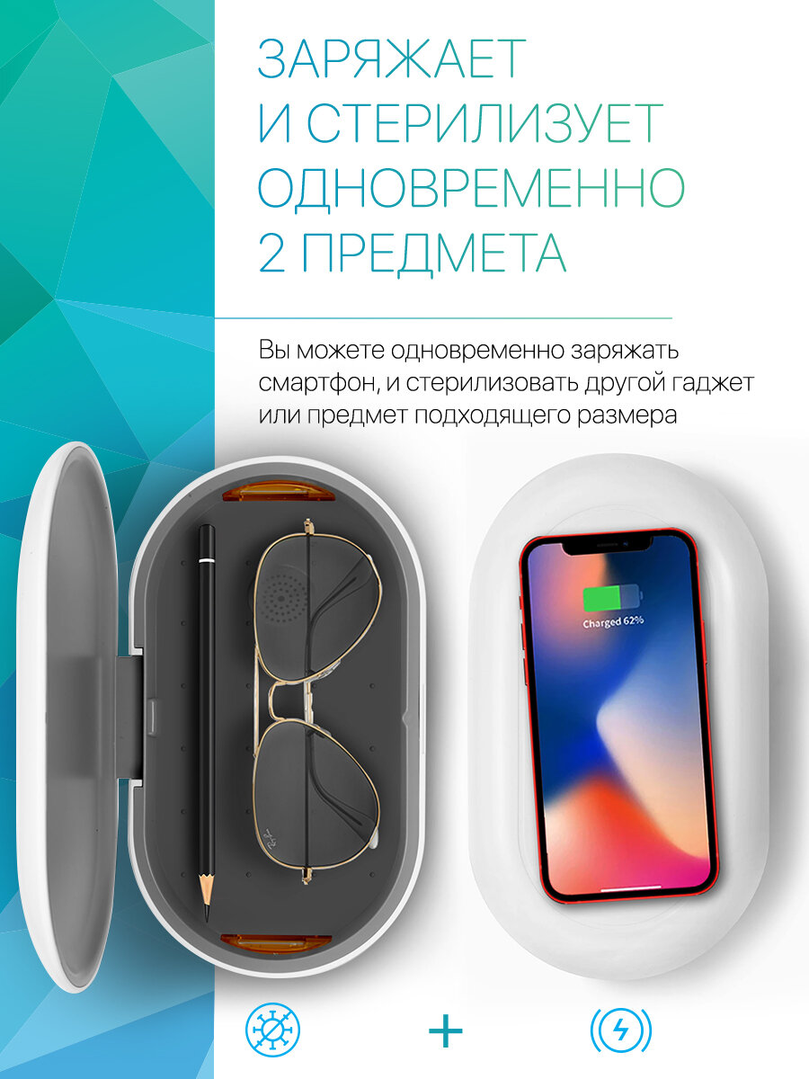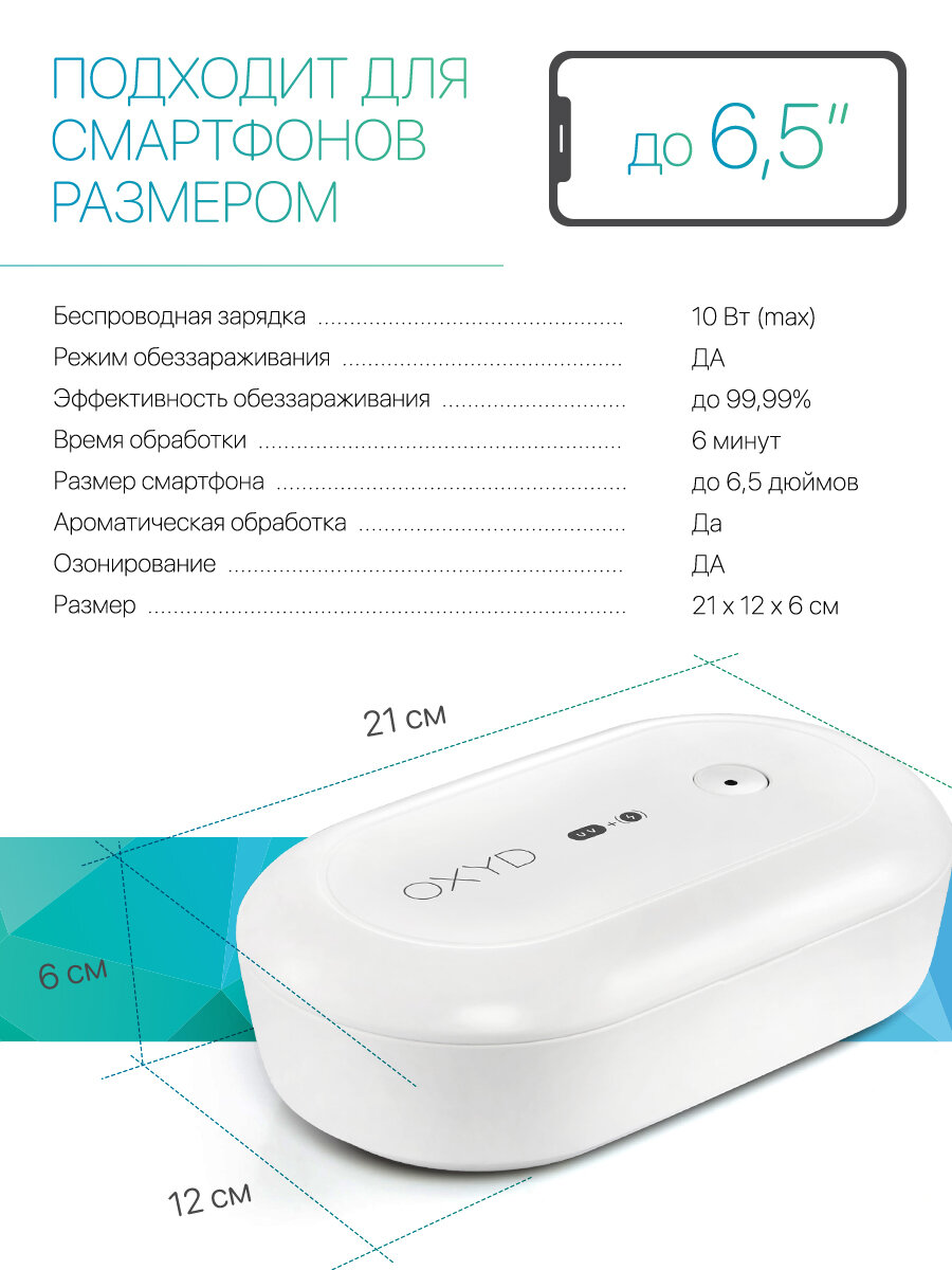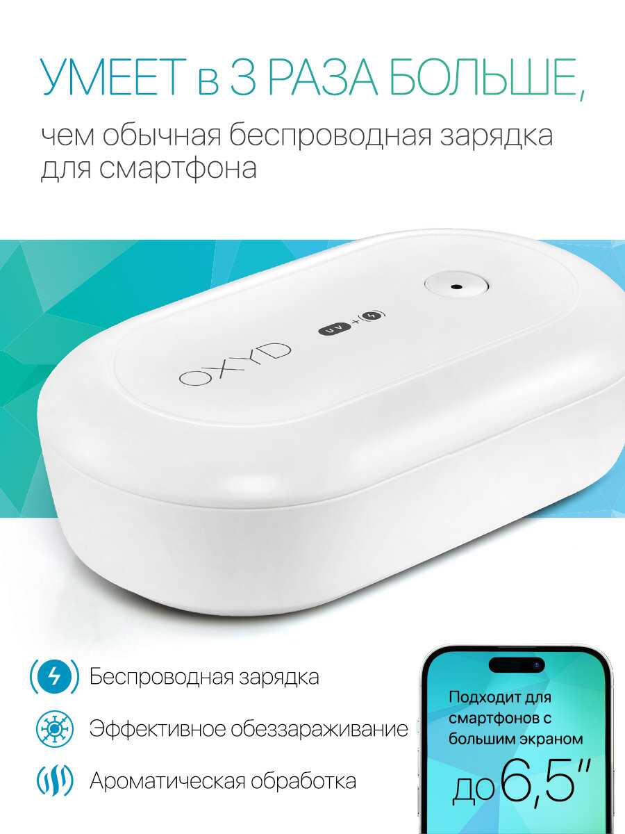 Портативный санитайзер OXYD OSWC-FVR-OJD-L03 White — многофункциональное устройство. В первую очередь он предназначен для обеззараживания смартфона и небольших предметов, подходящих по размеру. Достаточно положить девайс внутрь и закрыть крышку, после чего встроенная ультрафиолетовая лампа уничтожит бактерии и вирусы, находящиеся на его поверхности. Доступно два режима обработки — обычный и ускоренный. Также санитайзер позволяет заряжать аккумуляторы мобильной электроники. У него есть разъем USB Type C, также поддерживается технология беспроводной зарядки. С помощью встроенного аромадиспенсера можно придать смартфону и другим предметам приятный запах.