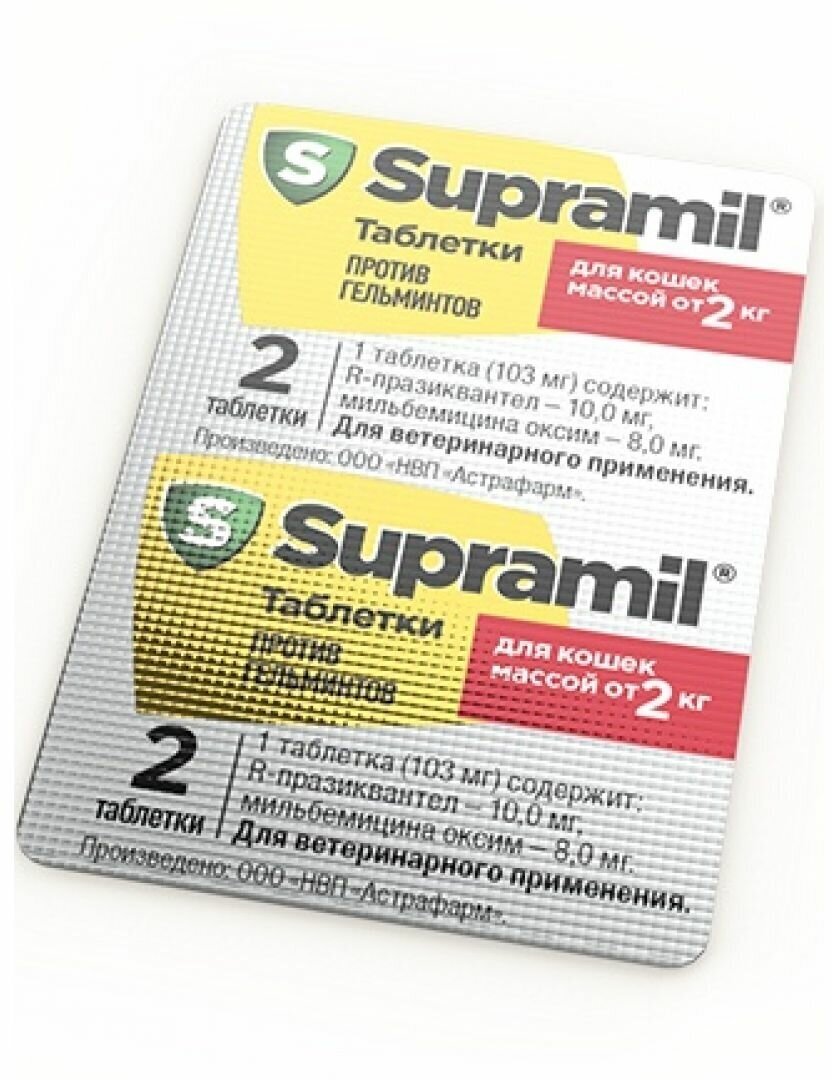 Таблетки от глистов Supramil применяют животным перорально, однократно, в утреннее кормление с небольшим количеством корма или вводят принудительно на корень языка после кормления в минимальной терапевтической дозе (на 1 кг массы животного): взрослым кошкам – 2,5 мг R-празиквантела и 2,0 мг мильбемицина оксима.