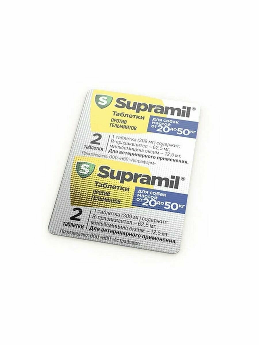 Supramil таблетки применяют животным перорально, однократно, в утреннее кормление с небольшим количеством корма или вводят принудительно на корень языка после кормления в минимальной терапевтической дозе (на 1 кг массы животного): взрослым собакам и щенкам – 2,5 мг R-празиквантела и 0,5 мг мильбемицина оксима.