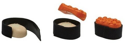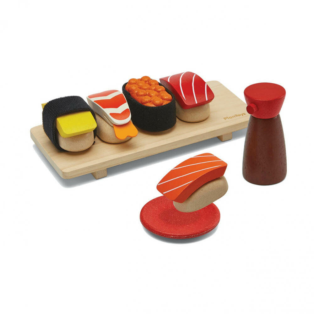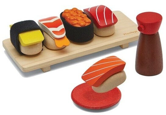 PlanToys — превратит ребёнка в сушиста. Малыш приготовит 5 видов суши и польёт их соевым соусом. Суши состоят из 12 отдельных частей, которые прикрепляются друг к другу на липучках.
