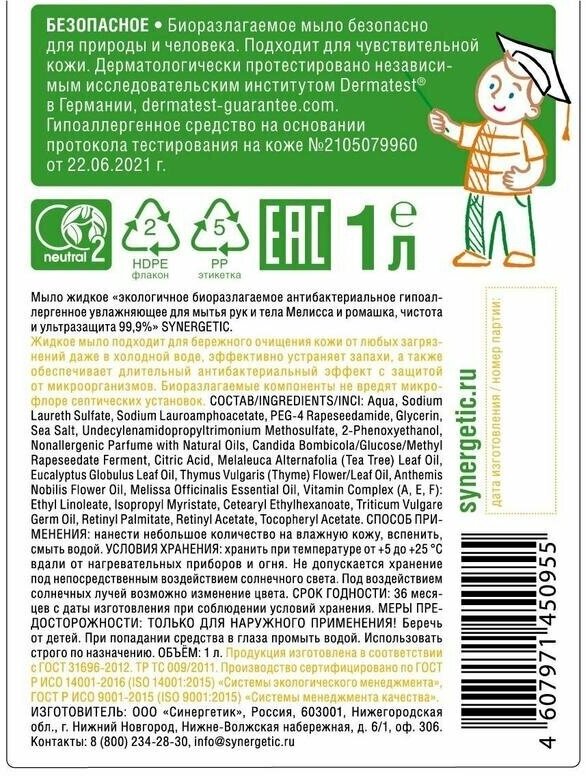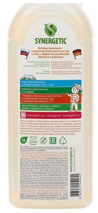 Жидкое мыло Synergetic "Мелисса и ромашка" 1л 4607971450955
