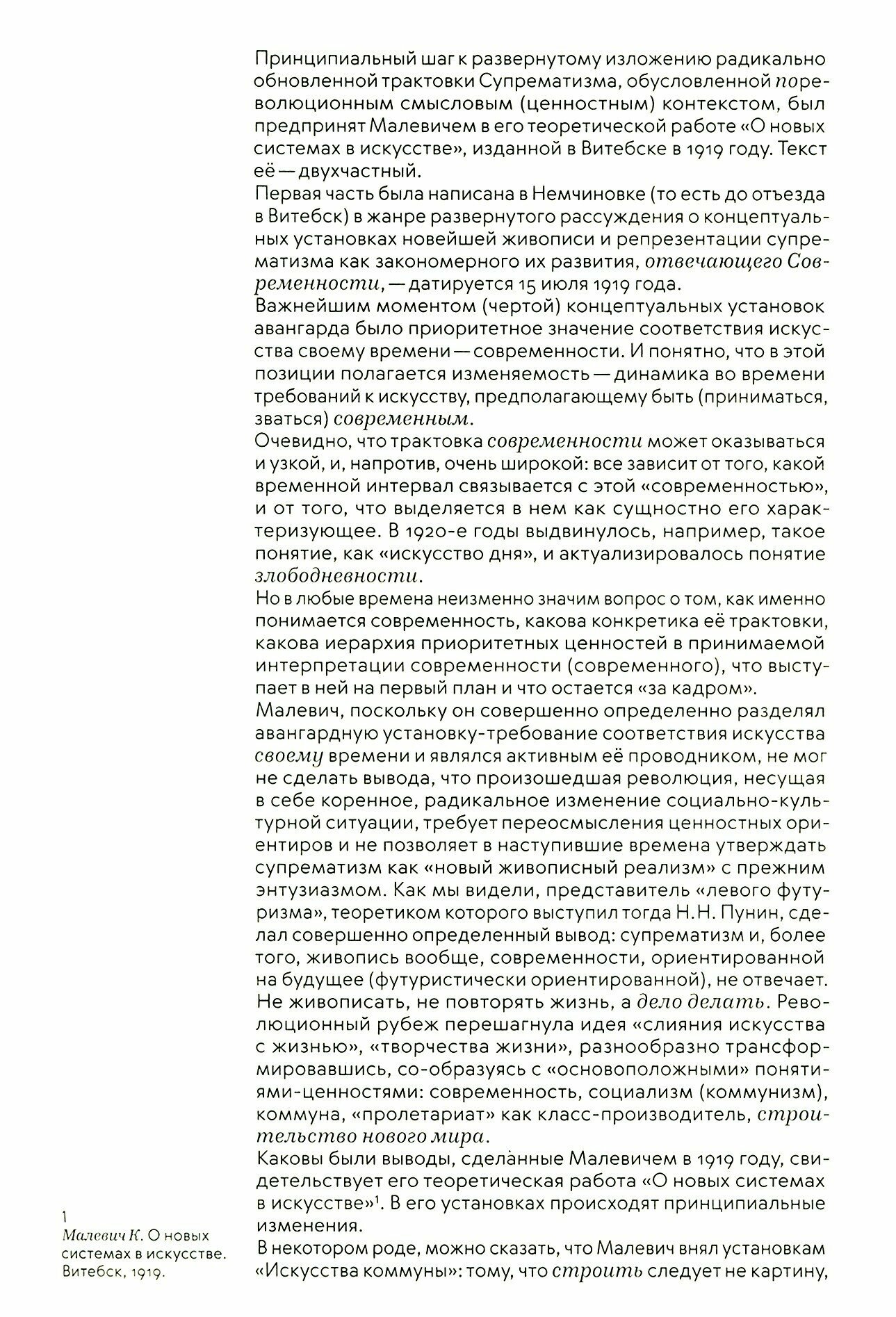 Монография продолжает начатое Е.В. Сидориной в конце 1960-х годов исследование концептуального многообразия русского авангарда (включая и его философскую ветвь) и посвящена осмыслению истоков и сущностных особенностей сложного «маршрута» творчества Казимира Малевича, концептуальной путеводной нитью которого явилась идея супрематии беспредметности, а важнейшие черты – попытка совместить позицию пророка с позицией авангардного творческого лидера в России революционных лет, выход его размышлений к осознанию эсхатологического аспекта отношений бытия и искус ства (отношений «этого мира» и «мира иного») и итоговое устремление Малевича к высотам Искусства, названное им самим дальнейшим восхождением.