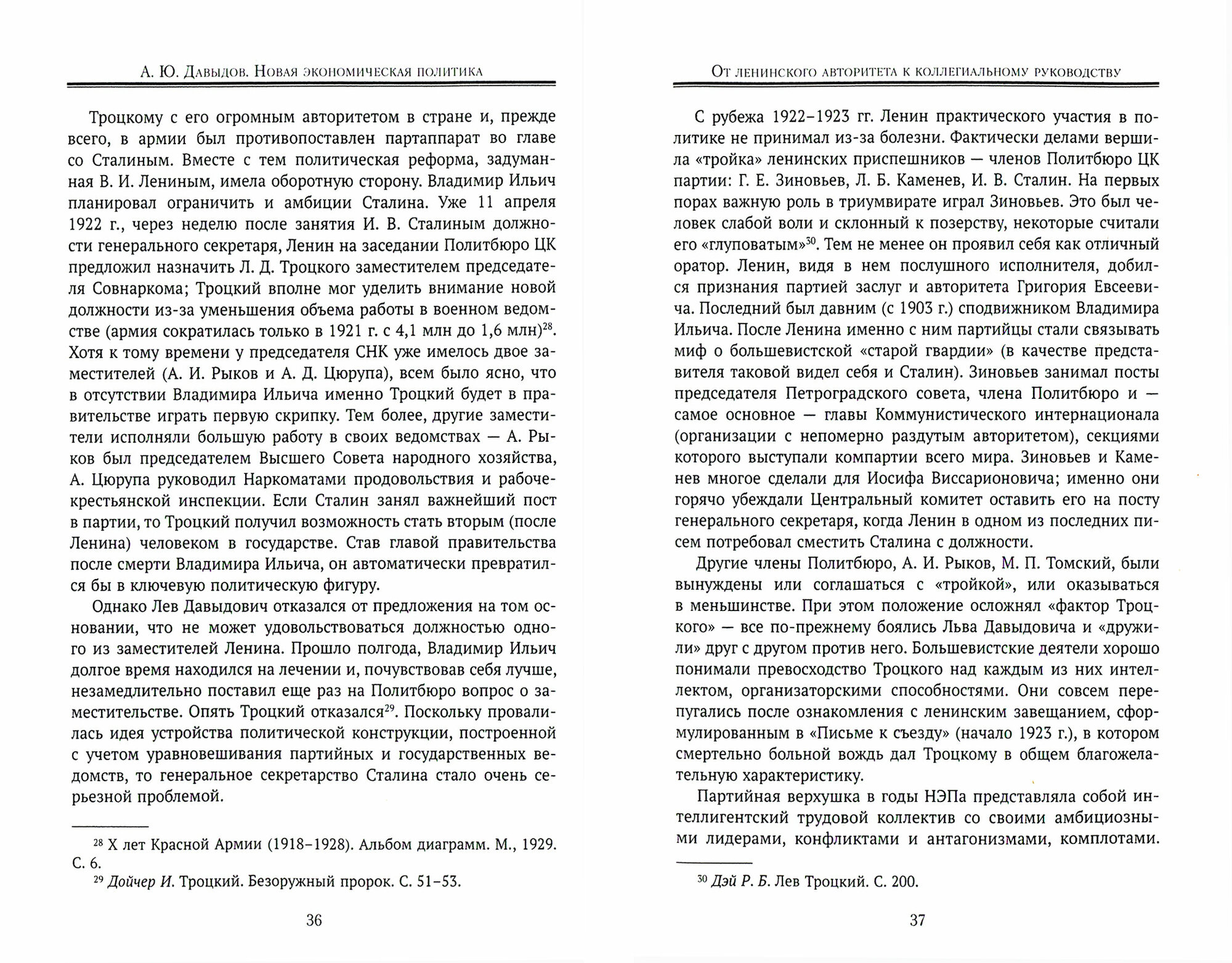 Новая экономическая политика (1921-1929 гг.) - комплекс мероприятий, осуществление которых не только содействовало восстановлению разрушенной в период "смуты" 1917-1921 гг. хозяйственной и социальной сфер, но и заложило основу для модернизации российского социума. Присущие НЭПу элементы термидоризации власти нашли воплощение в приостановке общественного развития в плебейски-революционном направлении. Это позволило не успевшим отвыкнуть за годы военного коммунизма от привычки к напряженному труду россиянам поднять свою страну из праха. Особенно значимо то, что высокомотивированные рыночными условиями крестьяне, расширившие земельные наделы и освободившиеся от арендных платежей (в прошлом выплачивавшихся помещикам), приступили к осовремениванию аграрного производства. Предпосылкой успешной эволюции стало установление в политических элитах компромисса, воплотившегося в виде коллективного руководства. Однако на завершающей стадии НЭПа победило радикальное крыло компартии, приступившее к реализации самой жестокой версии социализма в СССР.