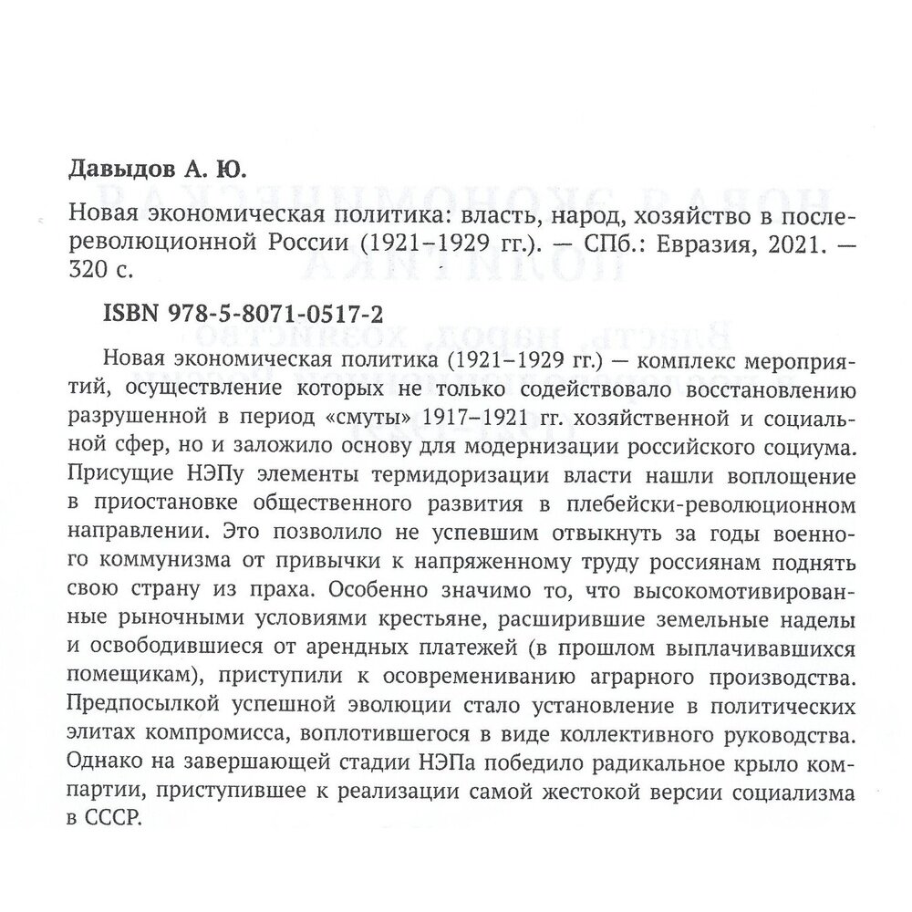 Новая экономическая политика. Власть народ хозяйство в послереволюционной России (1921-1929 гг.) (Давыдов Александр Юрьевич); Евразия, 2021