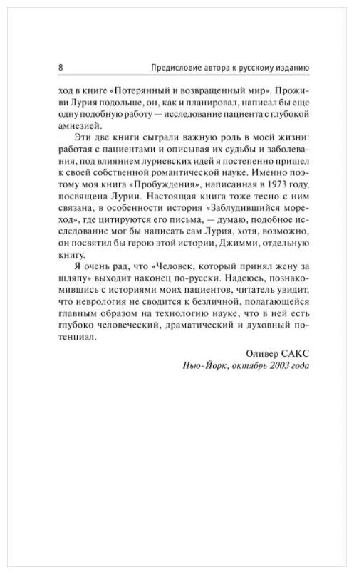 Книга названа в честь одноименного рассказа. Случай с мужчиной, у которого были проблемы с конкретным восприятием, и он перепутал любимую со шляпой, показался мне одним из самый необычных.