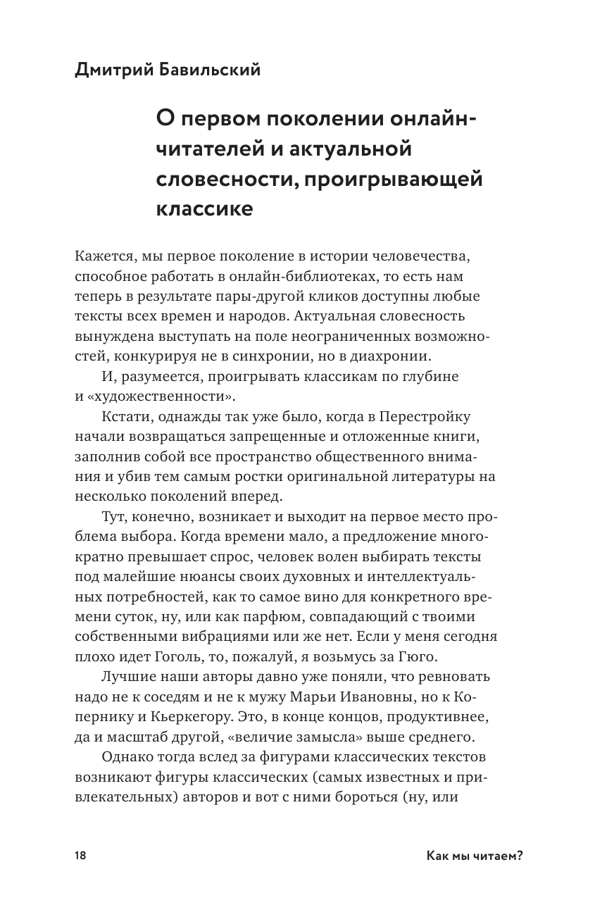 В 19-м веке у русской интеллигенции было два классических вопроса: "Кто виноват?" и "Что делать?". Курилки и интеллигентские кухни века 20-го добавили еще один: "Какой счет?" Похоже, наше время, превратившее и чтение, и писательство в занятие и по масштабу, и по качеству массовое, породило и четвертый: "Как читать?". Во всяком случае именно на него отвечают в объединенных под одной обложкой «заметках, записках, постах о современной литературе» 39 авторов этой книги. Какое из трех слов в ее названии главное, каждому из нас предстоит ответить самостоятельно. Она, помимо очевидного, и подаренная нам возможность понять, как, собственно, писатели читают чужие тексты, и некий штрих к портретам самих писателей и критиков - ибо сквозь призму размышлений о чужих текстах они сообщают что-то и о себе, то, что, возможно, остается скрытым в их стихах, прозе, критических статьях. И вот, как в калейдоскопе - из мнений, замечаний, сиюминутных записей, наблюдений, подчас ироничных, подчас саркастических или бескомпромиссных - «складывается» портрет современного литературного процесса, каждый участник которого – не только писатель, но и читатель. А быть читателем – дар не менее значимый, чем писательский, об этом писал еще Мандельштам в "Армии поэтов"