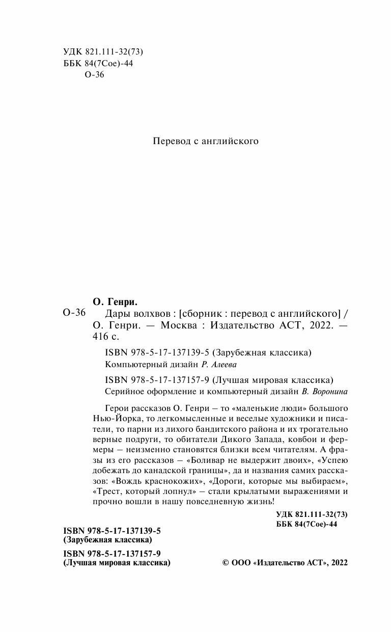 «Дары волхвов» - это сборник мудрых, тонких, душевных и не только рассказов американского писателя О.Генри. Очень часто данного автора сравнивают с Антоном Павловичем Чеховым: обладая поразительной емкостью текстов, он также писал кратко, но очень содержательно. Тот житейский оптимизм, который наделен одноименный рассказ, вселяет надежду и веру в человеческое. Книга пришла в отличном состоянии, обложка твердая и красивая