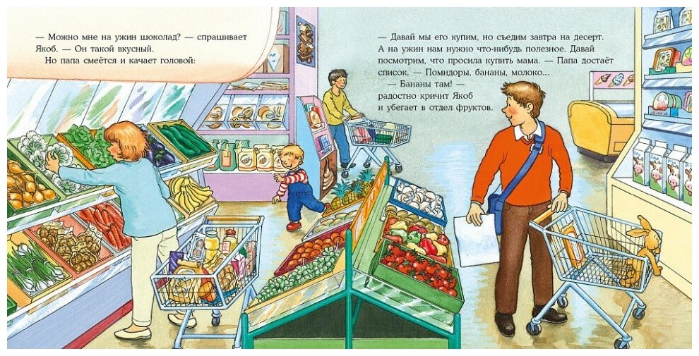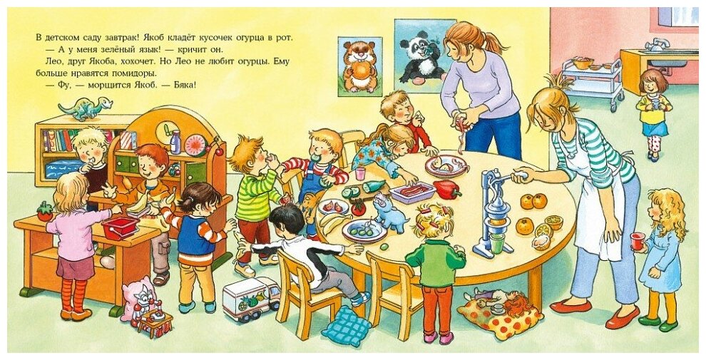 Как и у любого ребенка, у Якоба есть любимые блюда, например, огурцы. Но ничего нового он пробовать не хочет. Вдруг не понравится. Но однажды папа предлагает игру: он пробует банан, а Якоб — помидор. И Якоб откусывает маленький кусочек...