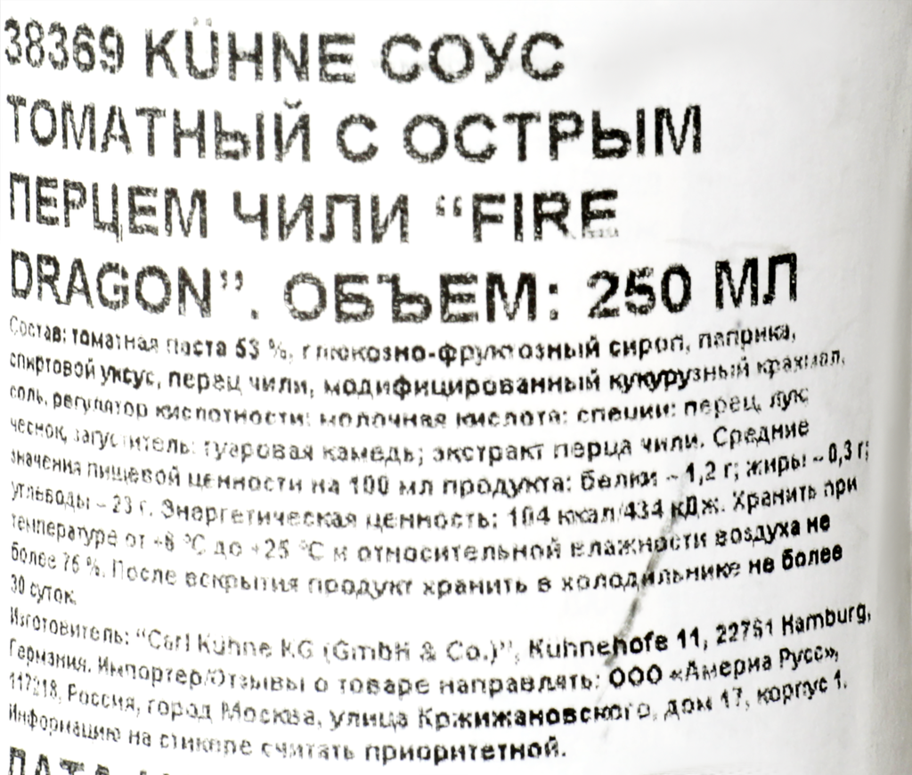 Состав: томатная паста, глюкозо-фруктозный сироп, паприка, спиртовой уксус, острый перец чили, сахар, модифицированный крахмал, соль, натуральный ароматизатор, регулятор кислотности: молочная кислота, специи, чеснок, загуститель: гуаровая камедь, экстракт перца чили