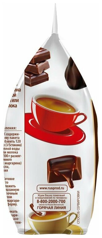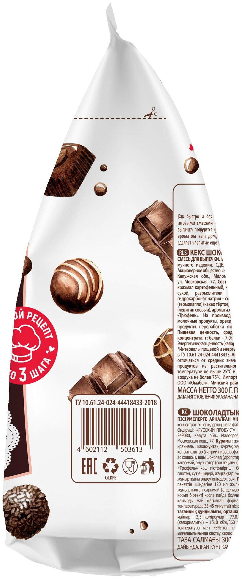 Состав: Мука пшеничная высшего сорта, сахар, крахмал картофельный, какао-порошок, яичный меланж сухой, регулятор кислотности – лимонная кислота, разрыхлитель - гидрокарбонат натрия (сода пищевая), ароматизатор Трюфель.