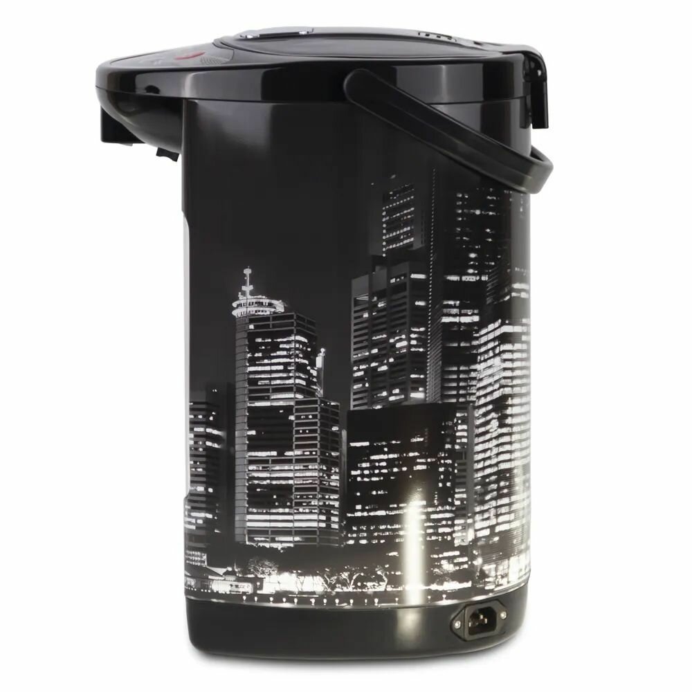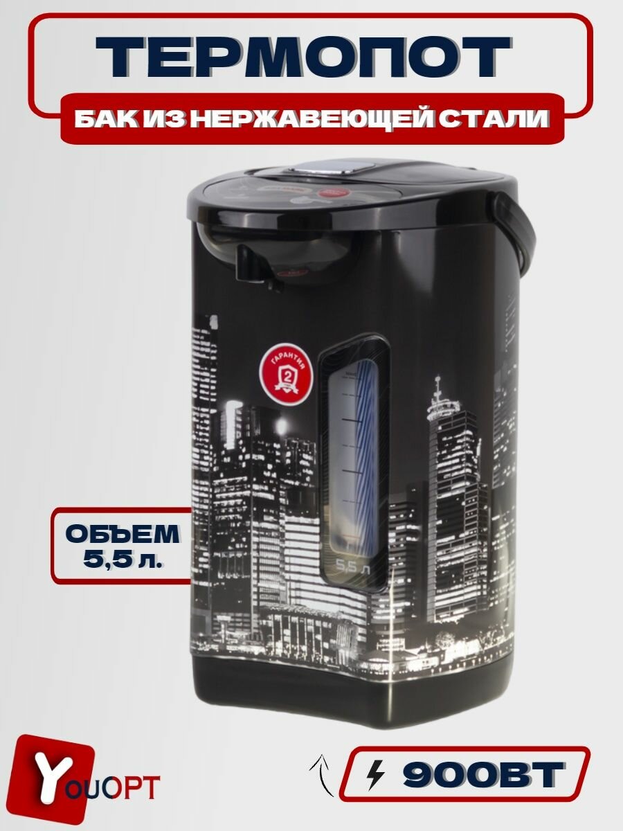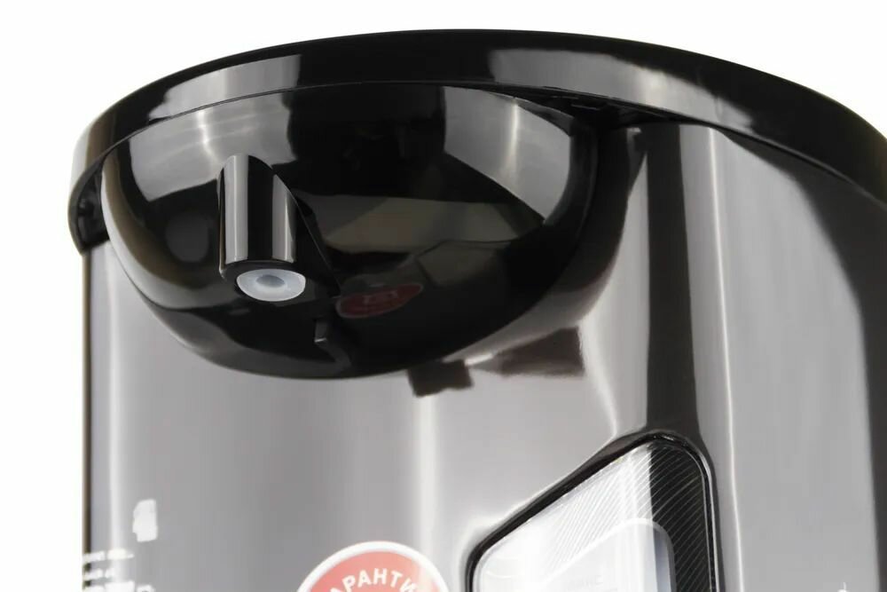 Чайник-термос AP-603IS бытовой электрический прибор сочетающий в себе функции электрочайника и термоса. Чайник-термос снабжён поворотным механизмом. Гарантийный срок эксплуатации прибора 2 года. На модели установлен нижний нагревательный элемент мощностью 900 Ватт, который несомненно увеличит срок службы поттера. Температура кипячения 100 градусов Цельсия, температура поддержания температуры 95 градусов Цельсия. Внешний корпус выполнен из чёрного пластика и нержавеющей стали. На передней панели установлена стильная шкала с минимальными и максимальными обозначениями уровня воды в приборе. Ёмкость для нагрева воды из нержавеющей стали объемом 5,5 литра. В верхней части корпуса расположена крышка с оригинальной отделкой нержавеющей сталью. На ней расположено отверстие для выпуска пара при кипячении, а также кнопка, нажатием на которую открывается сама крышка. Кнопка хромированная оригинального дизайна. Сама крышка съёмная, для удобства чистки прибора. Чайник-термос снабжён пластиковой ручкой для удобства переноса. На верхней части поттера расположена и панель управления. Кнопка «ПОДАЧА ВОДЫ» красного цвета включает электронасос и подаёт воду в чашку. Нажатием кнопки «ПОВТОРНОЕ КИПЯЧЕНИЕ» включается принудительный режим кипячения воды в поттере. На панели управления расположены два световых индикатора. Индикатор «поддержание температуры» сигнализирует о готовности чайника-термоса к работе, индикатор «кипячение» показывает процесс нагрева воды. Наполнить чашку водой можно нажатием на рычаг находящийся под носиком прибора. Длина сетевого шнура поттера с сечением провода 3Gx0,72мм 120 сантиметров.