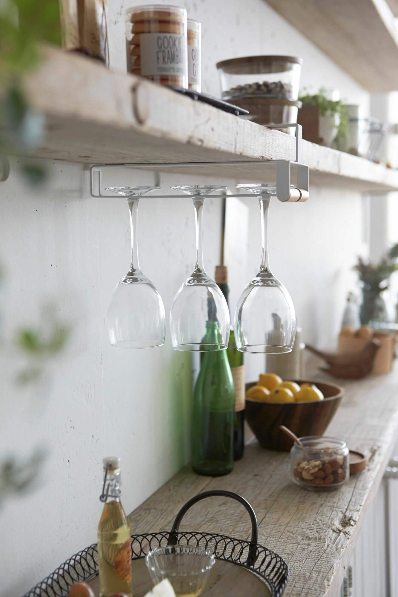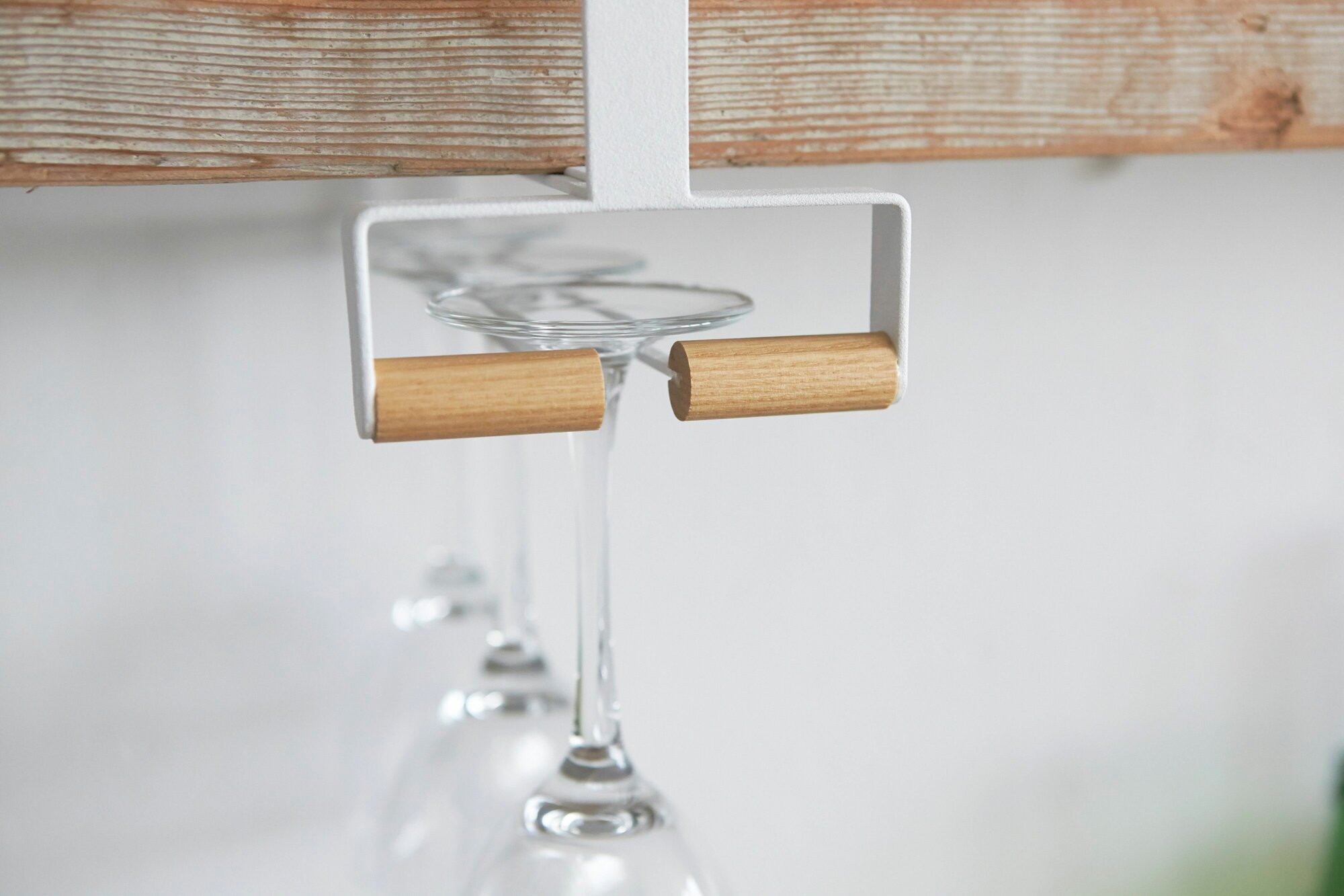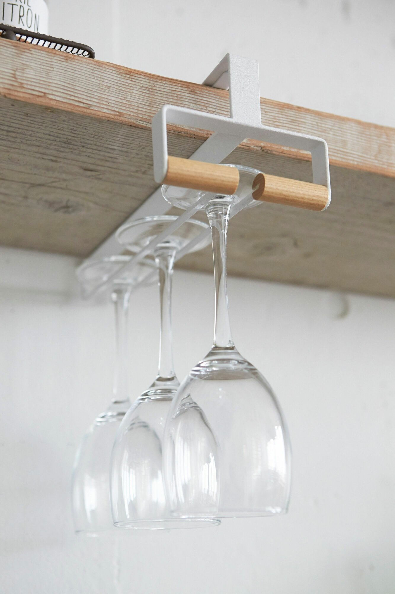 Подвесной держатель для стаканов TOSCA. Материал: Корпус: сталь; Перекладины: дерево. Размер: длина 26, ширина 11, высота 8. Цвет: белый. Держатель крепится к полке, что позволяет поместить стаканы в перевернутом состоянии, надежно подвесив их за ножки. Благодаря этому, ваши стаканы всегда будут чистыми, так как такое расположение препятствует оседанию пыли. Гармоничное сочетание дерева и стали прекрасно дополнит ваш кухонный интерьер.