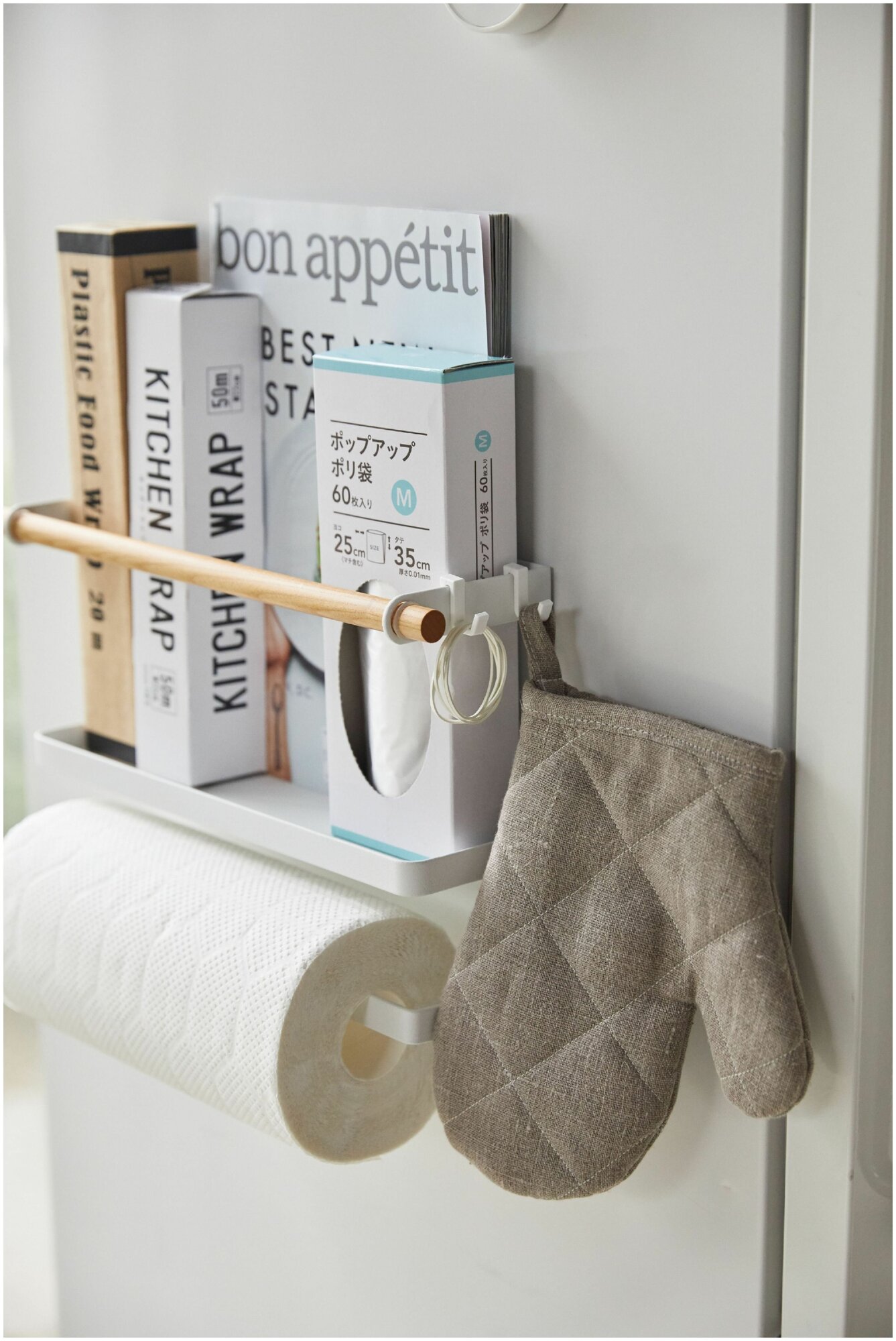 Магнитнный держатель для бумажных полотенец TOSCA. Материал: Корпус: сталь; Перекладина: дерево. Стоппер: силикон. Крючки: АБС-пластик. Размер: Ширина 32, длина 9,5, высота 20. Цвет: Белый. Храните рулоны бумажных полотенце и различные мелкие предметы вместе с этим современным держателем. Задняя часть магнитная, поэтому ее можно легко прикрепить к металлическим поверхностям таким, как холодильник. Вы также можете использовать прилагаемые в комплекте крючки, чтобы повесить мелкие предметы сбоку.