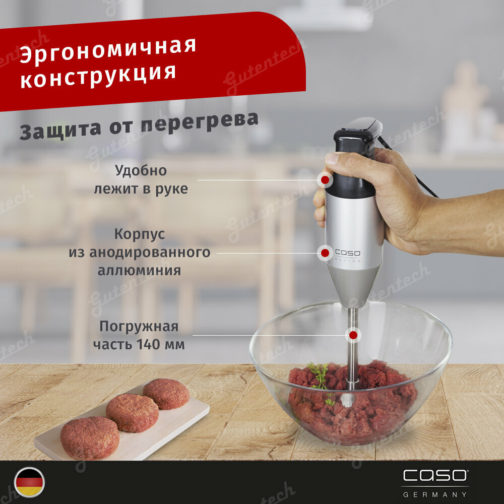 Помощник на кухнеТворите кулинарные шедевры с блендером CASO . Решите много задач одним компактным устройством. Один мотор, который может измельчать овощи и фрукты, быстро нарубить продукты, смешать напиток, взбить сливки.Используйте универсальный измельчитель для приготовления пюре. Диск-венчик подходит для перемешивания или измельчения ингредиентов. Нож для мяса подойдёт, чтобы мелко нарубить курицу, свинину и говядину для обжарки, приготовления котлет или других кулинарных изысков.Особенности:Эргономичная конструкция: купол погружной насадки сохраняет чистоту.Эргономичная ручка.Долговечный мотор мощностью 170 Вт.Высокая скорость работы до 22 000 об/мин.Просто очистить после работы.Быстрая смена насадок.Большой выбор насадок для десятков задач и сотен блюд.
