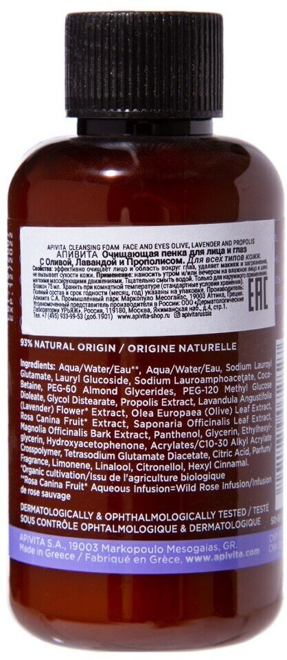 Apivita Миниатюра Очищающая пенка для лица и глаз с Оливой Лавандой и Прополисом флакон 75 мл (Apivita ) (ЭХ99989407407)