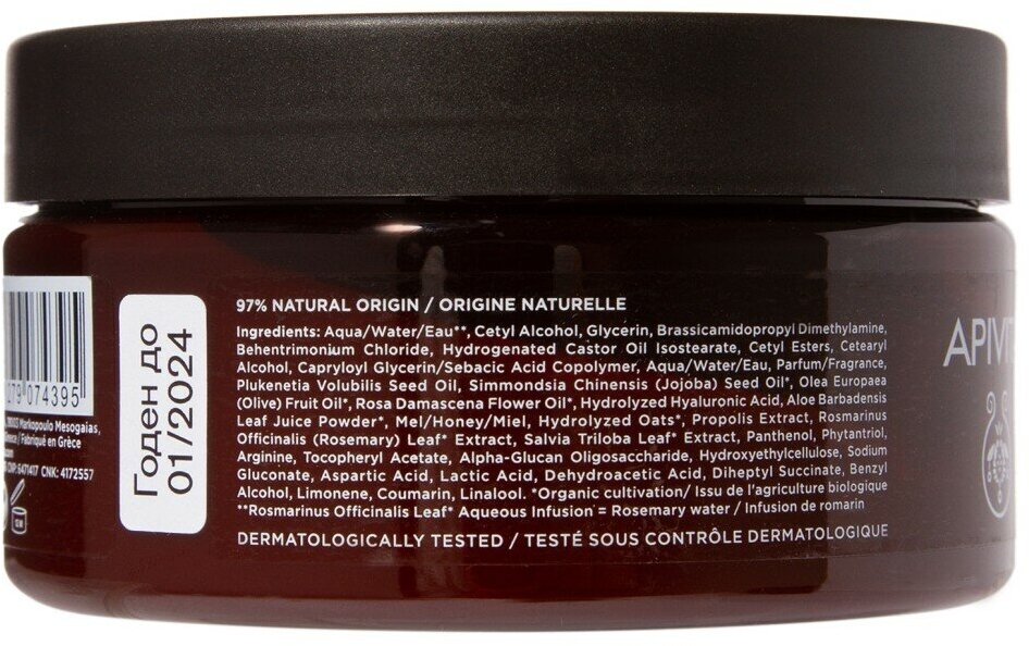 | Состав | Aqua/Water/Eau; Cetyl Alcohol; Glycerin; Brassicamidopropyl Dimethylamine; Behentrimonium Chloride; Hydrogenated Castor Oil Isostearate; Cetyl Esters; Cetearyl Alcohol; Capryloyl Glycerin/Sebacic Acid Copolymer; Aqua/Water/Eau; Parfum/Fragrance; Plukenetia Volubilis Seed Oil; Simmondsia Chinensis (Jojoba) Seed Oil*; Olea Europaea (Olive) Fruit Oil; Rosa Damascena Flower Oil; Hydrolyzed Hyaluronic Acid; Aloe Barbadensis Leaf Juice Powder; Mel/Honey/Miel; Hydrolyzed Oats; Propolis Extract; Rosmarinus Officinalis (Rosemary) Leaf Extract; Salvia Triloba Leaf Extract; Panthenol; Phytantriol; Arginine; Tocopheryl Acetate; Alpha-Glucan Oligosaccharide; Hydroxyethylcellulose; Sodium Gluconate; Aspartic Acid; Lactic Acid; Dehydroacetic Acid; Diheptyl Succinate; Benzyl Alcohol; Limonene; Coumarin; Linalool. Organic cultivation/ Issu de l'agriculture biologique Rosmarinus Officinalis Leaf Aqueous Infusion = Rosemary water / Infusion de romarin |