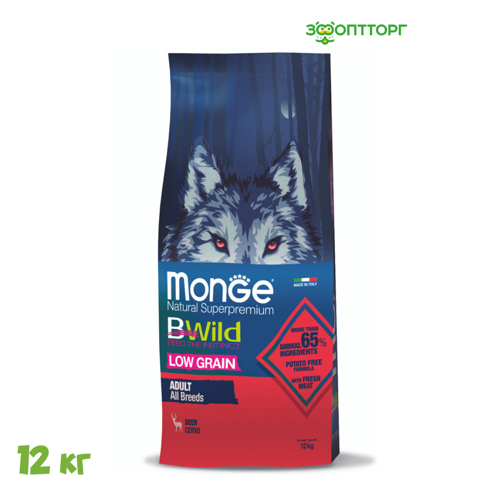 Monge BWild Low Grain с мясом оленя - полноценный сбалансированный рацион из мяса оленя для взрослых собак всех пород. Рацион разработан с высоким содержанием белка и с ограниченным количеством злаков, и не содержит картофеля. Оптимальный баланс Омега-3 и Омега-6 в составе корма чрезвычайно важен для поддержания красоты шерсти и здоровья кожи. Лесные ягоды и травы - источники питательных веществ, натуральной клетчатки и биологически активных компонентов. Наличие в рационе овощей и ягод увеличивает вкусовую привлекательность корма. Формула содержит Х.О.S., что помогает сохранить естественный баланс кишечной микрофлоры и способствует оптимальному усвоению питательных веществ.