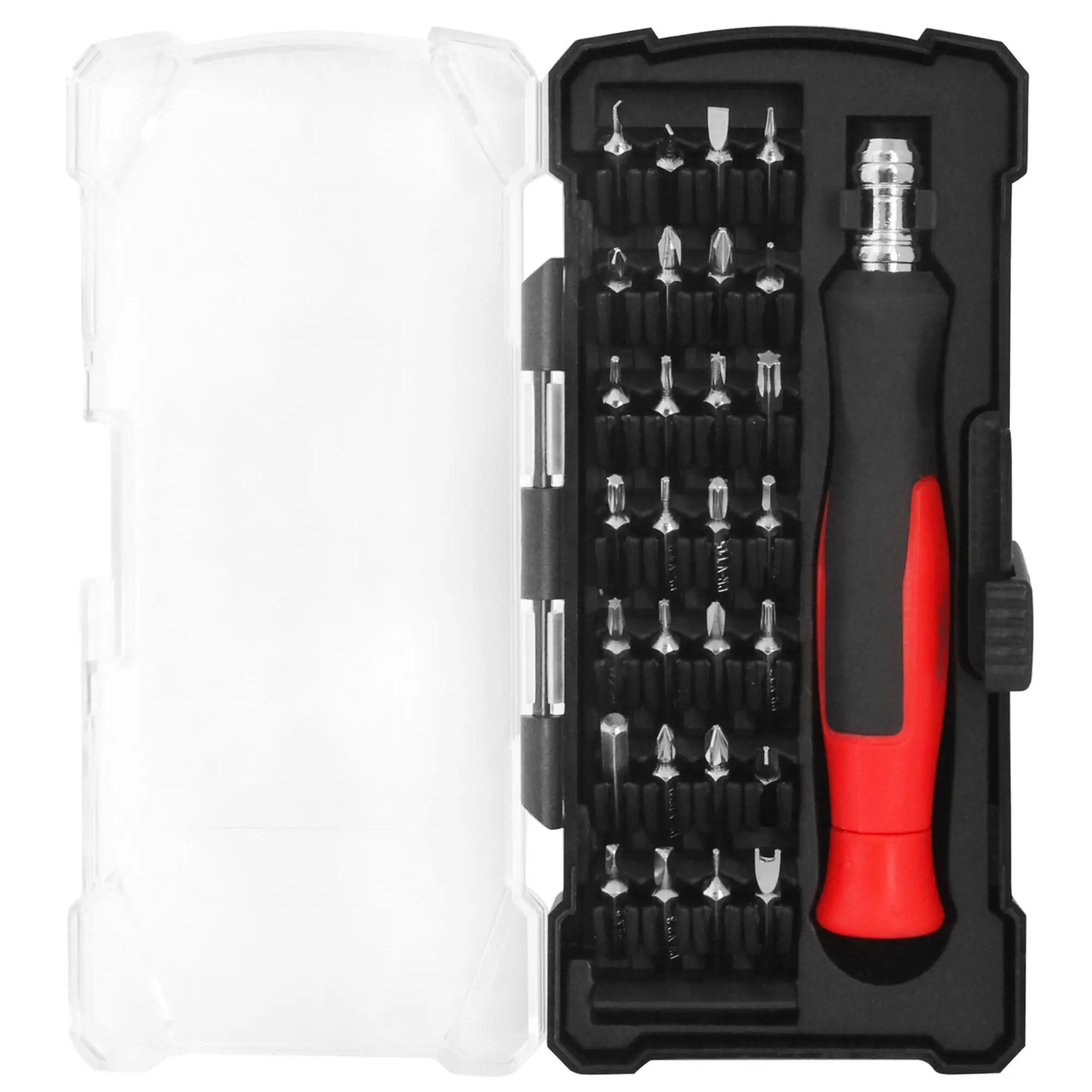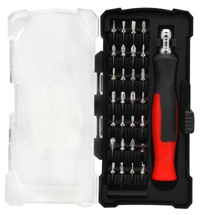 Набор бит для точных работ с держателем, 30 предметов. Нужен для работы с мелким крепежом, используется для точных операций по сборке и ремонту электроники, бытовой и компьютерной техники. Держатель вытянутой формы крепко ложится в руку, но достаточно удобный, чтобы вращать его пальцами. Пластиковый кейс облегчает хранение и перевозку комплекта, сохранит биты от потери.