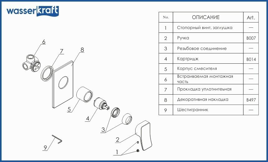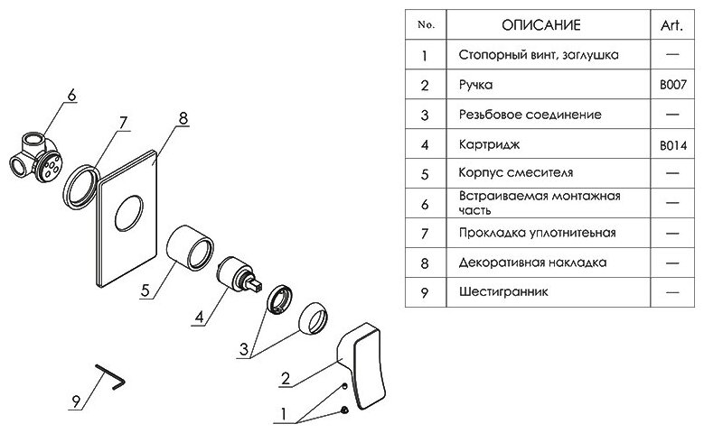 | ВКоробке | Смеситель - 1 шт. Монтажная часть - 1 шт. Инструкция - 1 шт. |