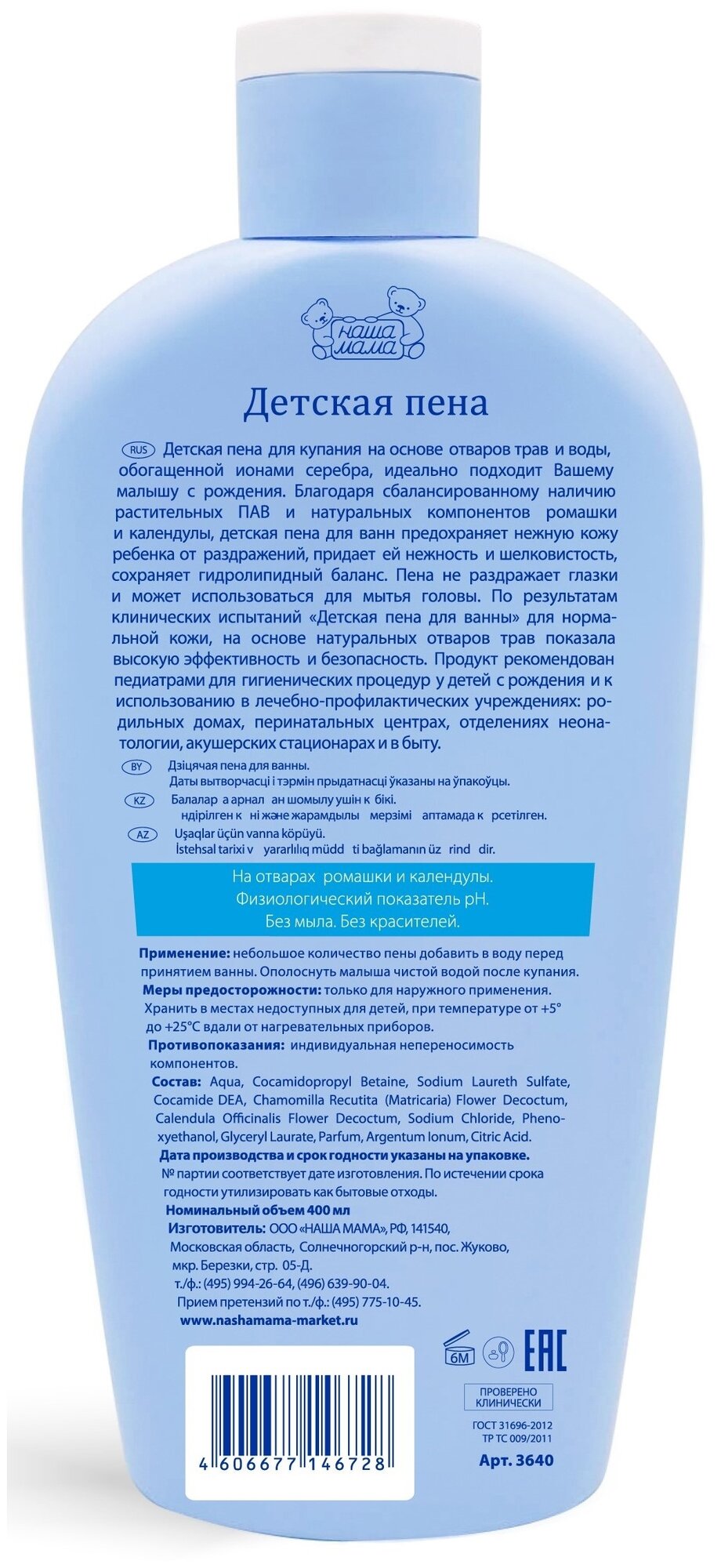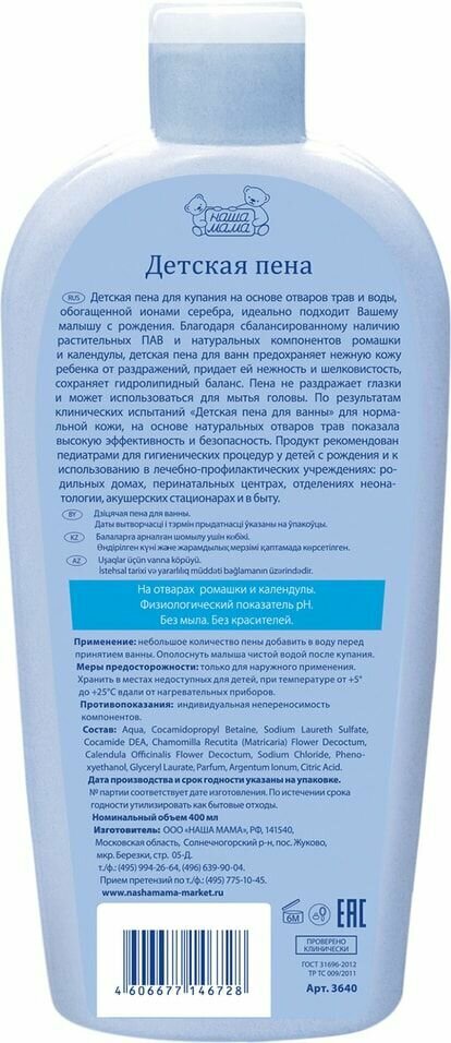 Детская пена для купания на основе отваров трав и воды обогащенной ионами серебра, идеально подойдет для малыша с самого рождения. Благодаря сбалансированному наличию растительных ПАВ и натуральных компонентов ромашки и календулы, детская пена для ванн предохраняет нежную кожу ребенка от раздражений, придает ей нежность и шелковистость, сохраняя гидролипидный баланс. Пена не раздражает глазки и может использоваться для мытья головы. По результатам клинических испытаний "Детская пена для ванны" для нормальной кожи, на основе натуральных отваров трав показала высокую эффективность и безопасность. Продукт рекомендован педиатрами для гигиенических процедур у детей с рождения и к использованию в лечебно-профилактических учреждениях, родильных домах, перинатальных центрах, отделениях неонатологии, акушерских стационарах и в быту. Инструкция по применению: Небольшое количество пены добавить в воду перед принятием ванны. Ополоснуть малыша чистой водой после купания.