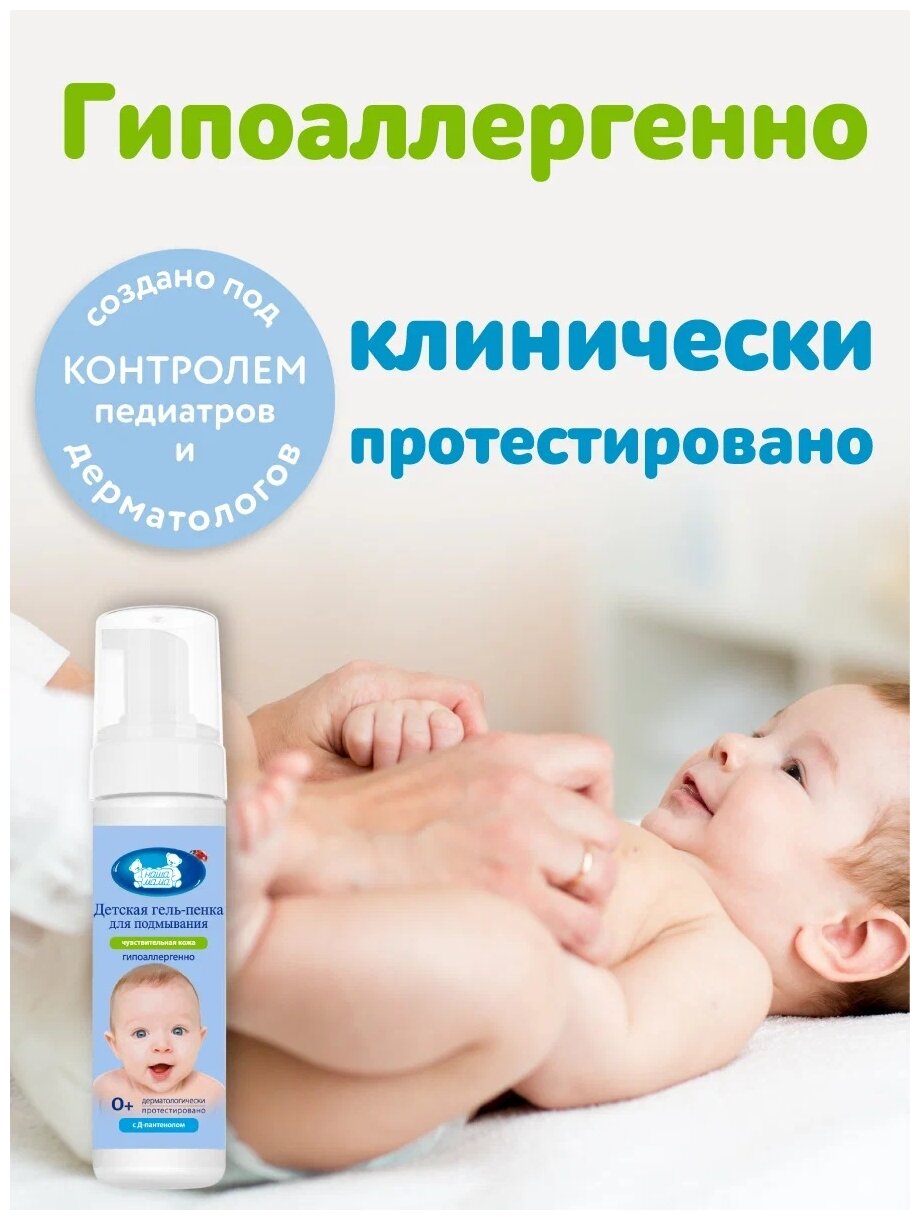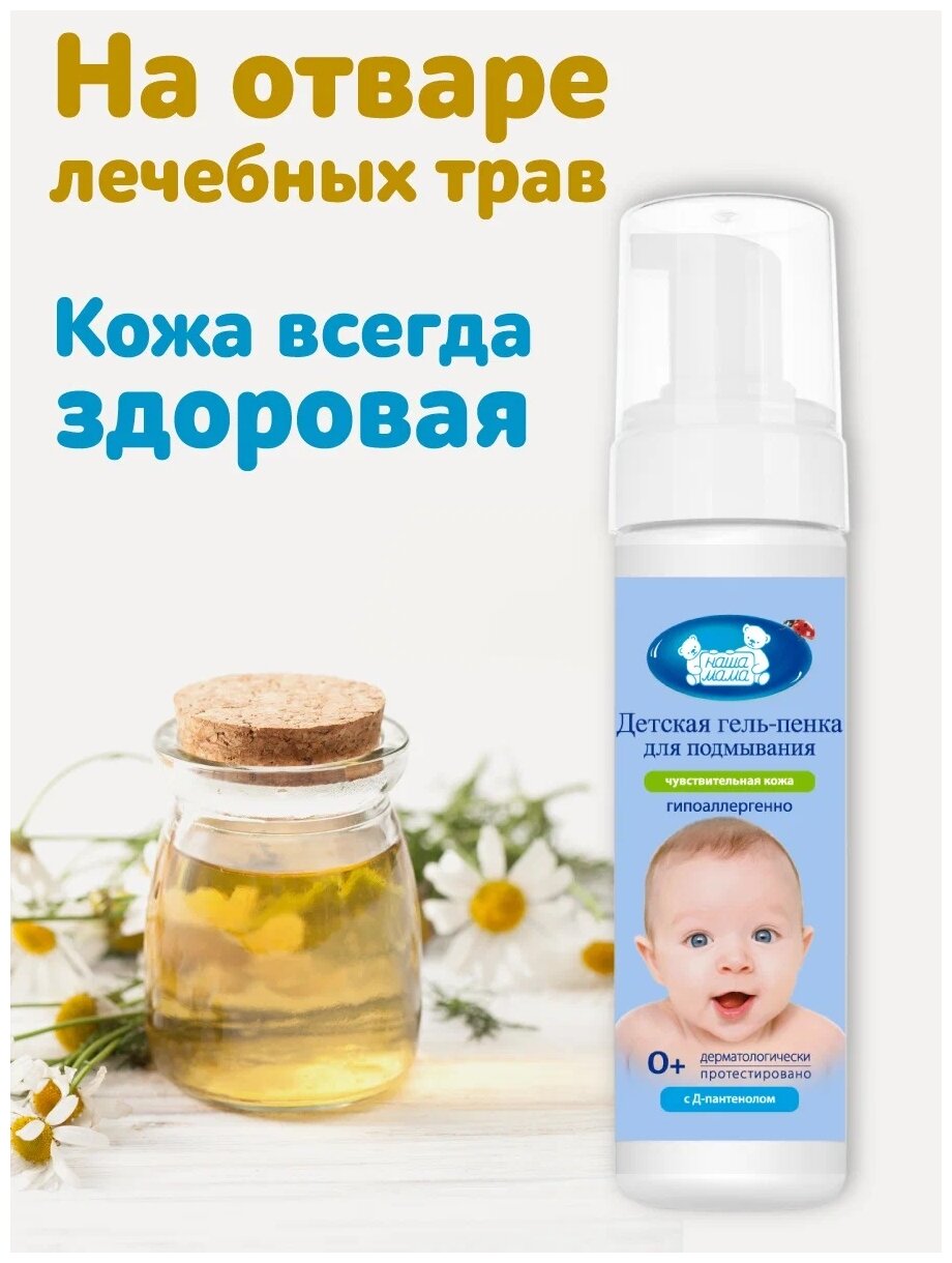 Детская гель-пенка для подмывания для чувствительной и проблемной кожи на основе отваров трав идеально подходит малышу с самого рождения. Благодаря мягкой моющей основе без мыла и красителей, воде обогащенной ионами серебра, Д-Пантенолу, бисабололу и отвару трав с активными натуральными компонентами череды и ромашки, детская пенка для подмывания нежно очищает, снимает покраснения и предохраняет чувствительную кожу ребенка в интимных зонах от раздражений. Воздушная гель-пенка обогащена кислородом и не сушит кожу. Инновационная запатентованная формула пенки разработана с учетом естественного pH кожи интимных зон малыша. По результатам клинических испытаний «Детская гель-пенка для подмывания для чувствительной и проблемной кожи», на основе натуральных отваров трав и Д-Пантенола, показала высокую эффективность и безопасность. Детская гель-пенка рекомендована для ежедневных гигиенических процедур у детей с чувствительной и проблемной кожей с рождения, и к использованию в лечебно-профилактических учреждениях, родильных домах, перинатальных центрах, отделениях неонатологии, акушерских стационарах и в быту. Применение: Нанесите небольшое количество пенки на кожу в интимных зонах ребенка, ополосните чистой водой. Повторите при необходимости. Рекомендации: Рекомендуем после подмывания использовать крем от опрелостей тройного действия или крем под подгузник серии «Наша мама». Противопоказания: Индивидуальная непереносимость компонентов.