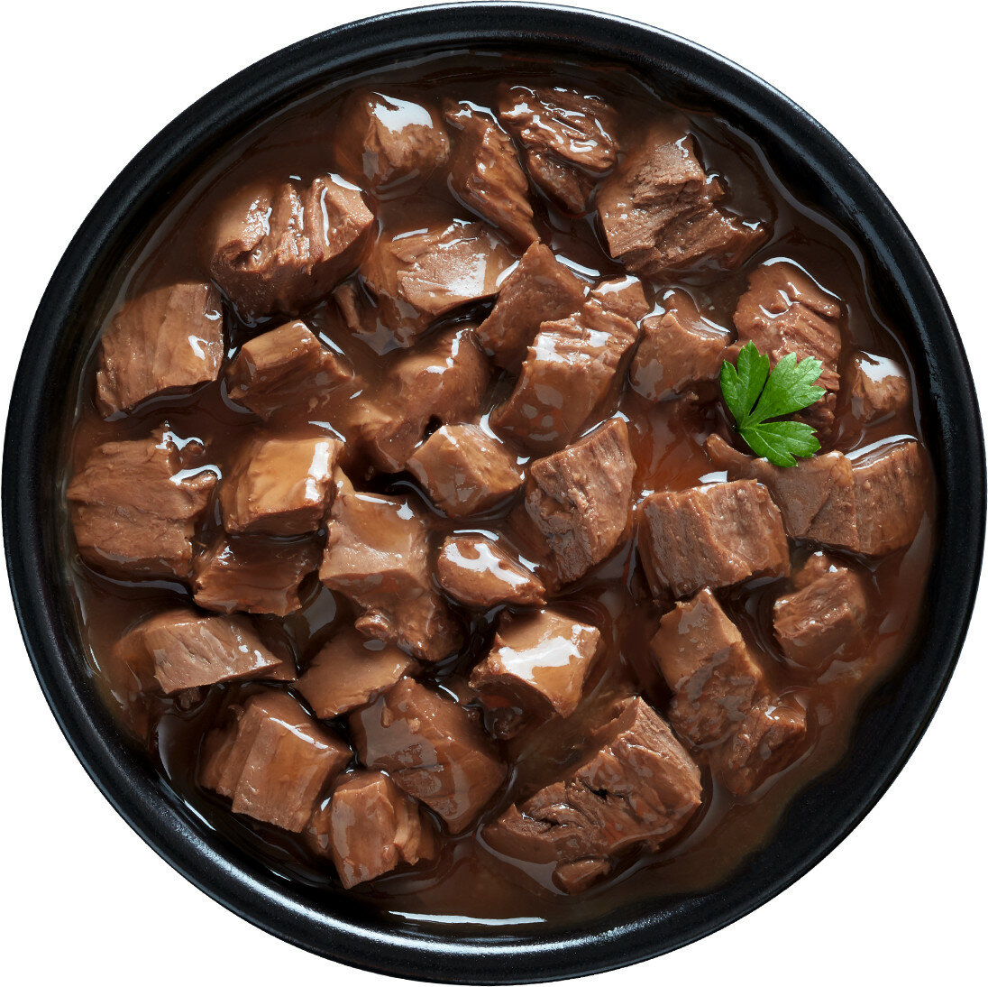 | Состав | мясо и субпродукты (в том числе говядина), продукты переработки злаков, загустители, минеральные вещества, аминокислоты (в том числе таурин), томаты сушеные, витамины, сахара, красители |