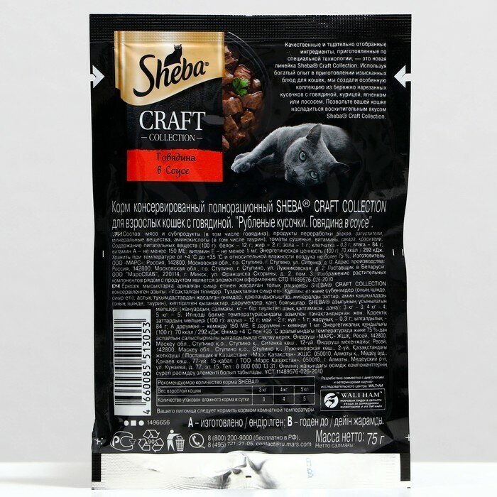 | Рекомендации | Рекомендуемое количество корма SHEBA® (вес животного, кг – упаковок корма в сутки, шт): 3 кг – 3; 4 кг – 4; 5 кг – 5. Вашего питомца следует кормить кормом комнатной температуры. |