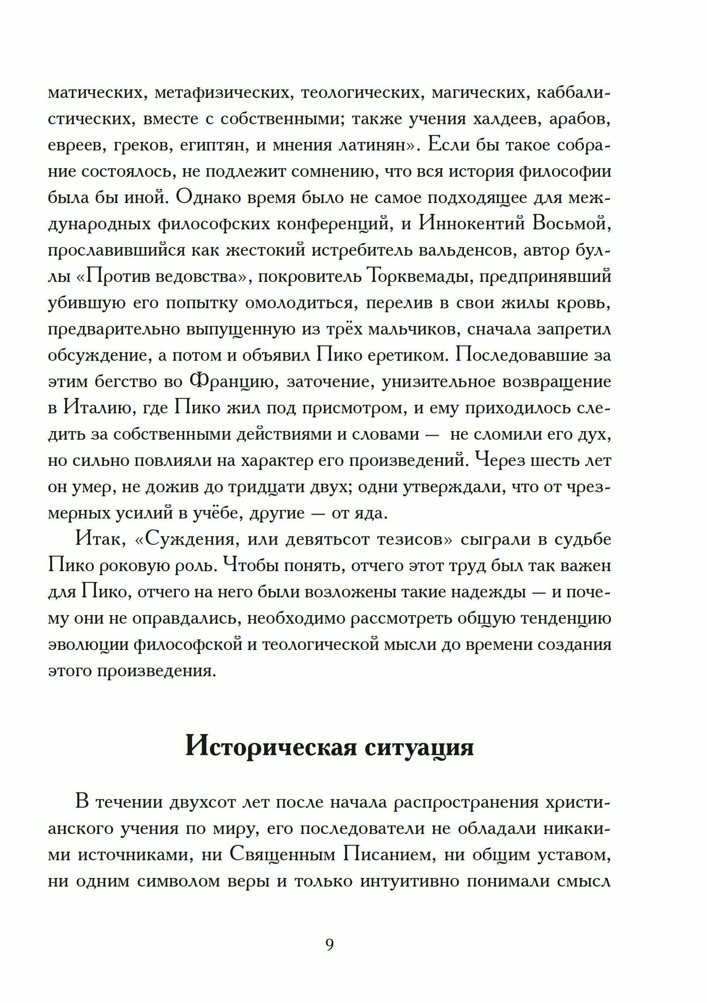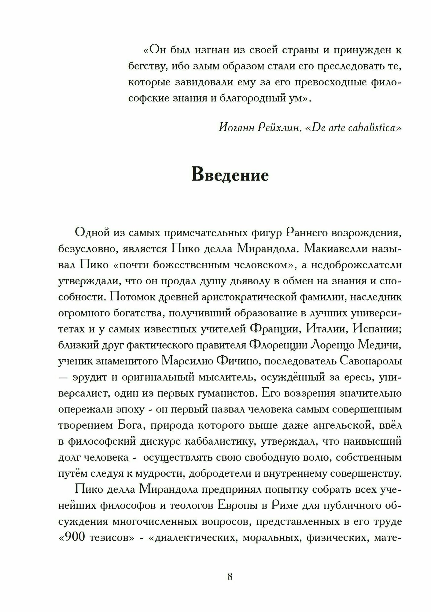 «Девятьсот тезисов» оказали огромное влияние на философскую мысль эпохи Возрождения и Нового Времени. Именно Пико делла Мирандола был первым, кто сказал, что свобода человеческого духа — благороднейший и опаснейший из даров; ведь человек, если он усердно и решительно развивает свой разум и дух, может подняться вровень с богами — или пасть ниже животного, если оставит себя в небрежении. Впервые целиком на русском языке.