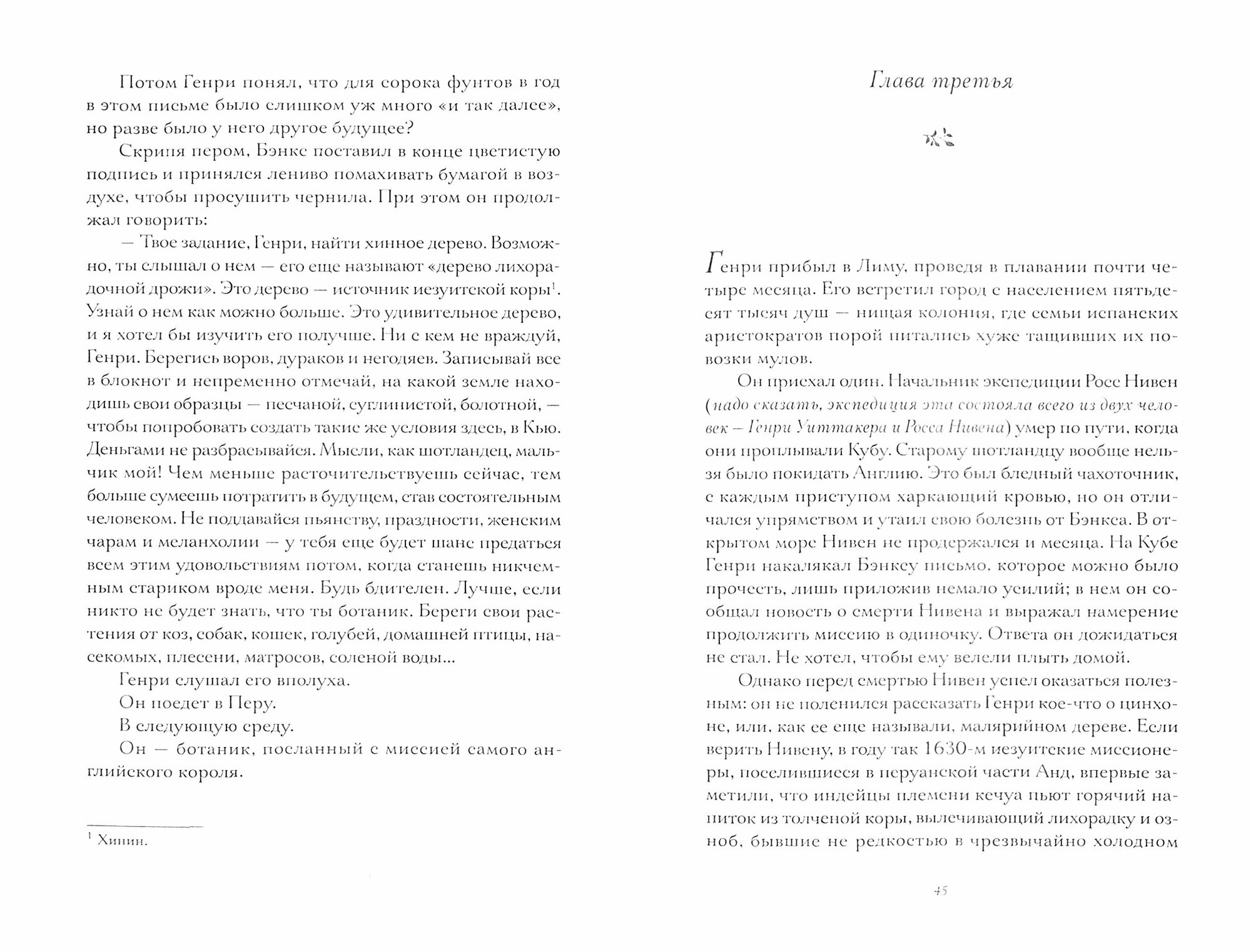 Необычная книга , это одновременно и любовный роман и приключенческий и качественная научно-просветительская литература. В основе сюжета история молодой женщины , выросшей в семье ученого-ботаника. Повествование быстрое , динамичное , почти без диалогов , с обилием сведений по естествознанию. Книга написана прекрасным литературным языком , в ней много ярких , колоритных персонажей. Получился увлекательный и мудрый роман о невероятной жажде человеческого познания.