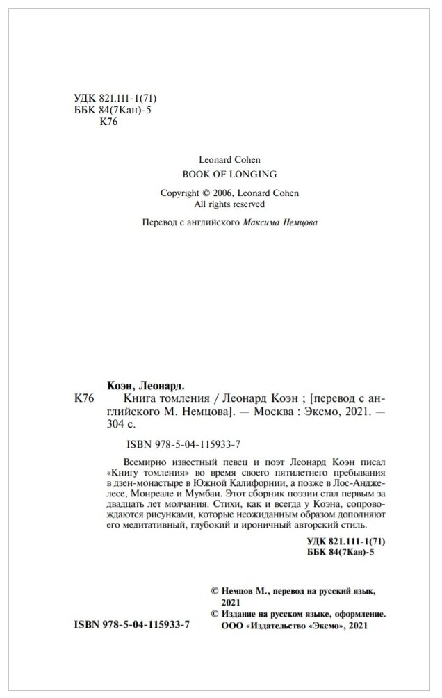 Книга: Книга томления (Коэн Леонард); ООО "Издательство "Эксмо", 2021