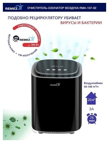 Прибор REMEZair – это высокотехнологичный очиститель+обеззараживатель для того или иного типа помещений, где требуется поддерживать чистоту и здоровья для посетителей и жильцов. Каждый фильтр справляется со своим типом загрязнений. Воздух постоянно проходит обработку компонентами прибора, в том числе, и излучением УФ спектра, а так же ионизатором.