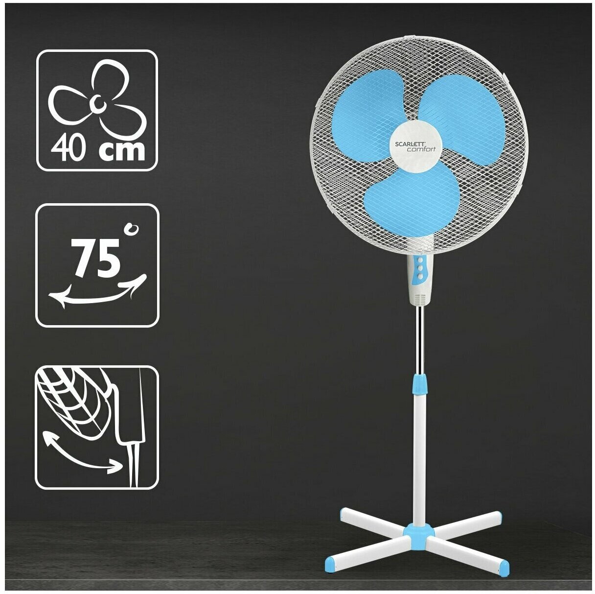 Вентилятор SCARLETT оснащён тремя скоростями работы, что позволит найти оптимальный режим для любых погодных условий. Напольный вентилятор выполнен в нейтральном бело-голубом дизайне, что позволит ему вписаться в абсолютно любой интерьер. Высококачественная защитная сетка делает устройство максимально безопасным в использовании, а возможность регулировки высоты, угла наклона и вращения поможет угодить любому пользователю.