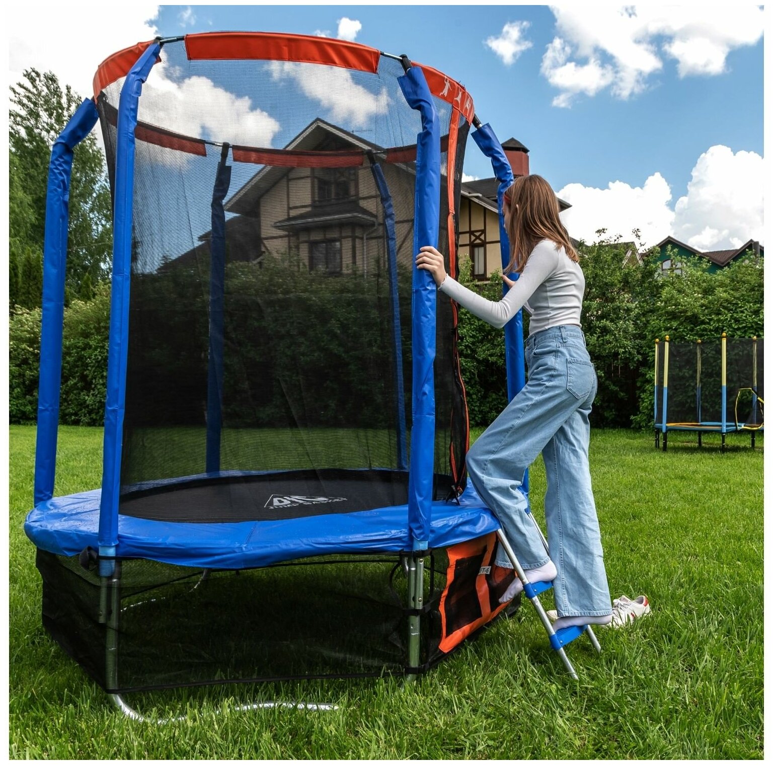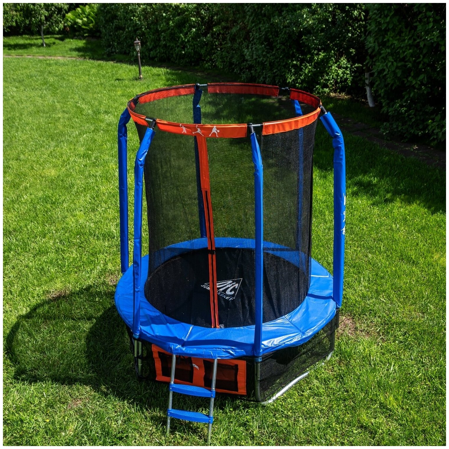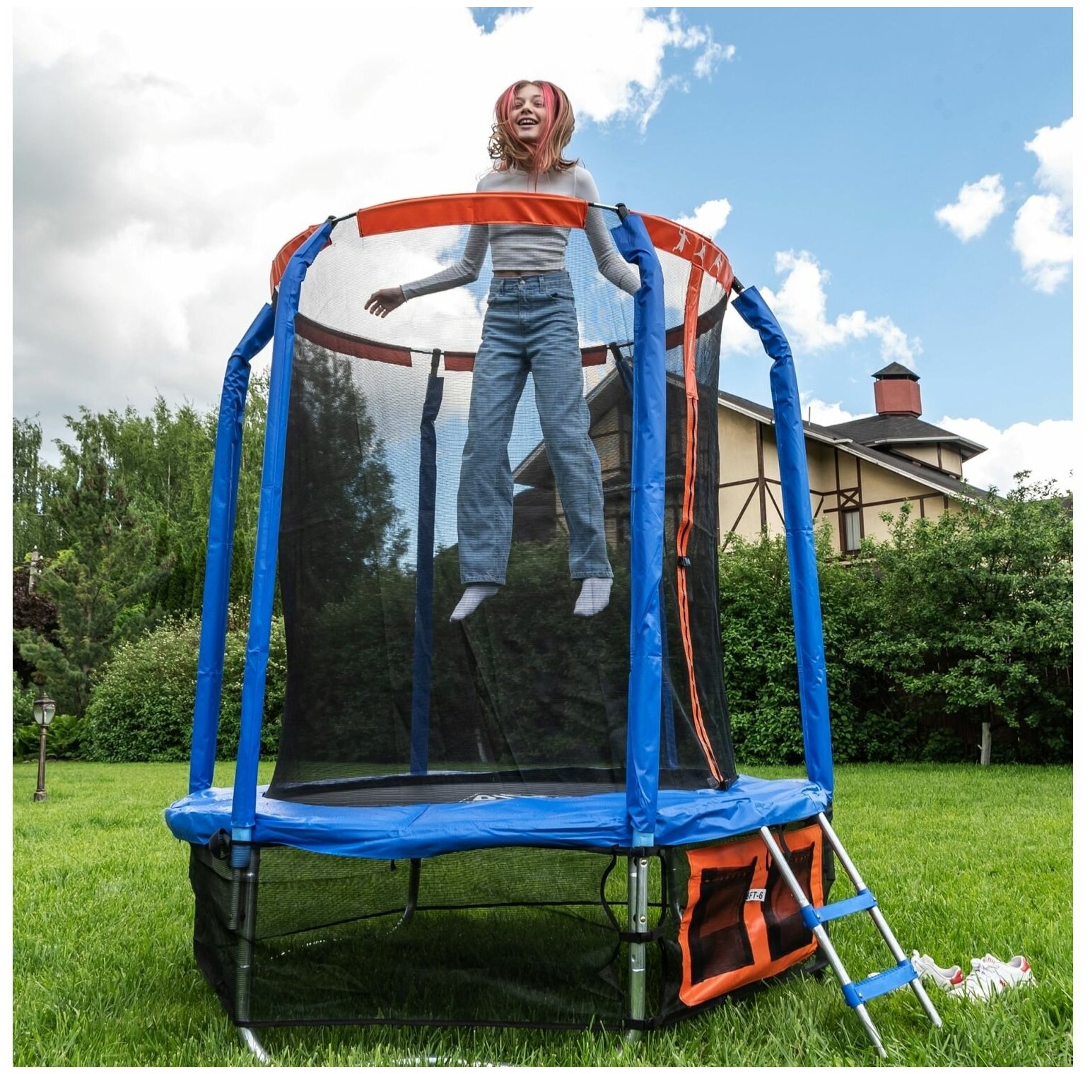 Для защиты детей вход/выход через сетку выполнен на молнии с фиксирующими защелками с внешней стороны. Защитная сетка под батутом и сумка для обуви входят в комплект поставки. Лестница для удобного входа в батут так же идет в комплекте.