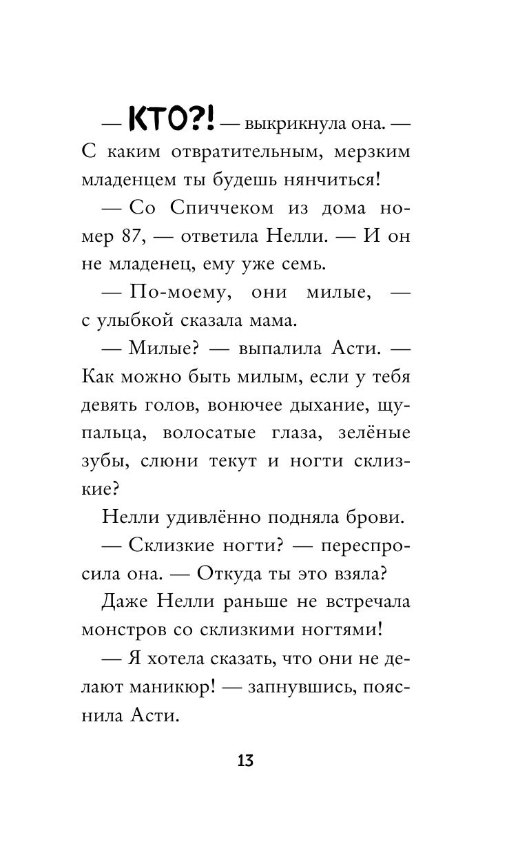 Книга небольшого формата, с твёрдой красивой обложкой. Бумага сероватая, шрифт не слишком крупный, с хорошим межстрочным интервалом, большое количество чернобелых иллюстраций. Тема монстров очень привлекает ребёнка, не смотря что это третья книга прочитана с удовольствием. Текст простой и понятный ребёнку. Большой морали конечно нет, но тем не менее книга ребёнку понравилась.