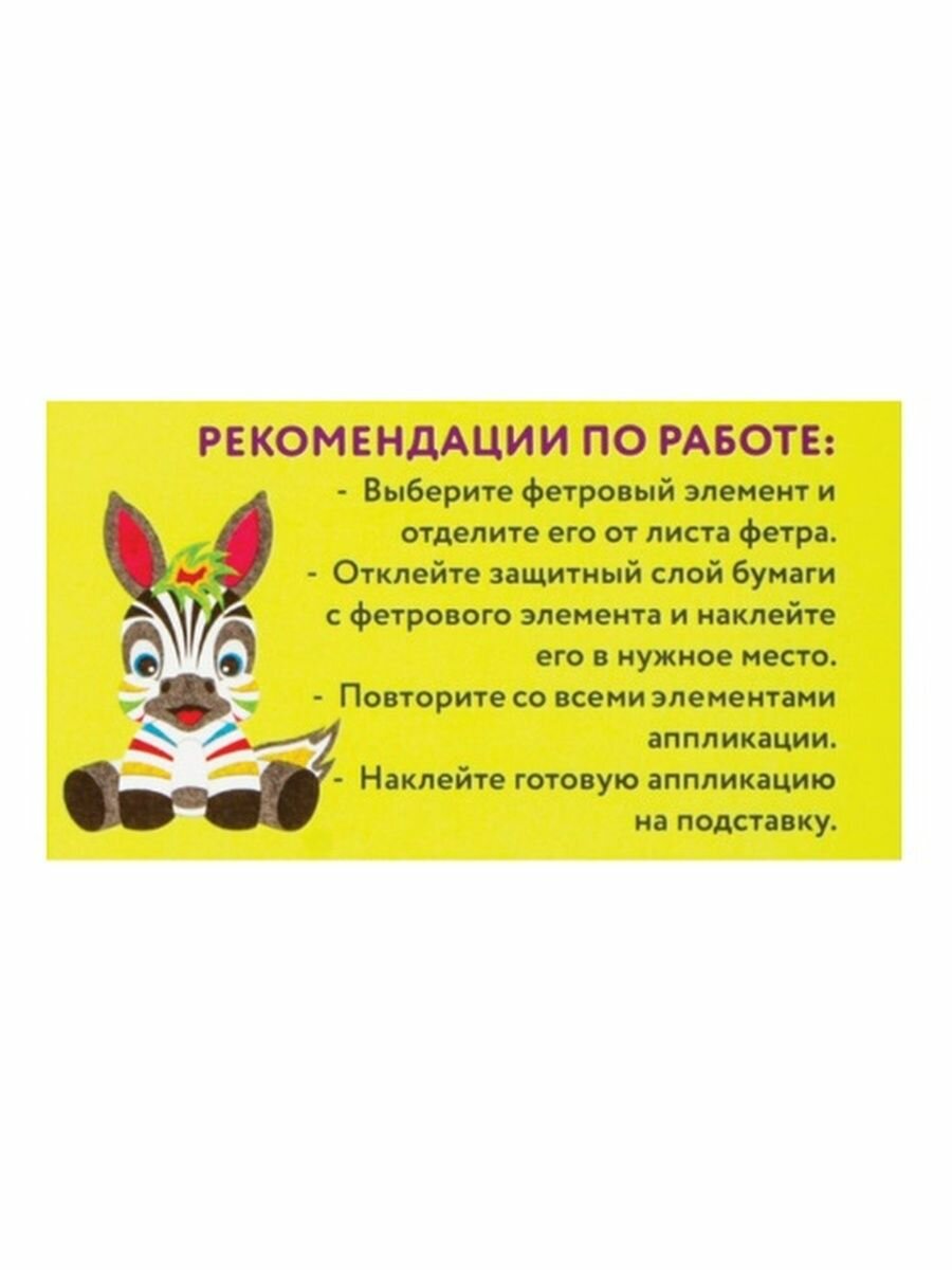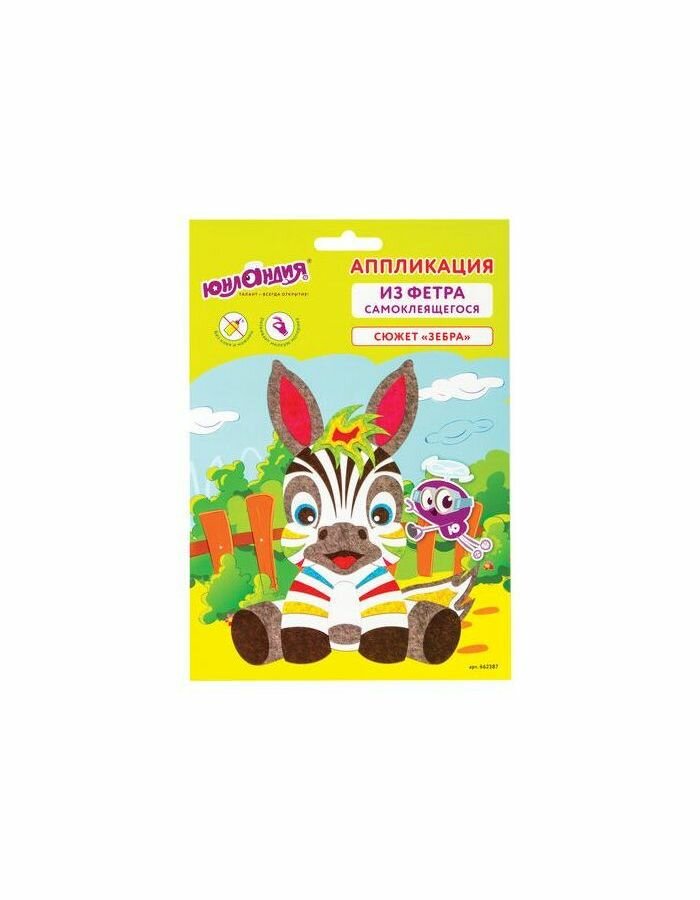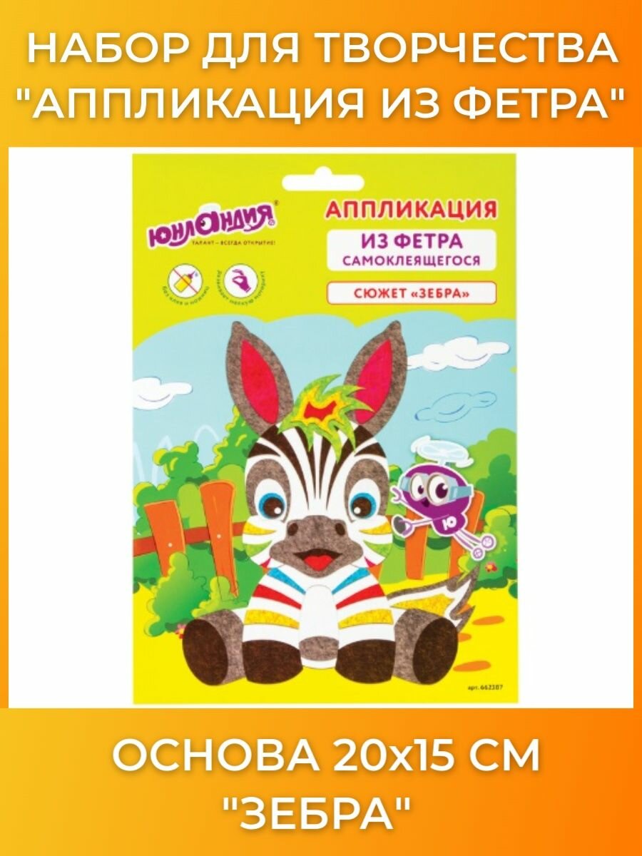 Аппликация из фетра ЮНЛАНДИЯ "Зебра" - это весёлый и занимательный способ развития мелкой моторики, аккуратности и фантазии ребёнка. Все элементы в составе самоклеящиеся, для работы не требуются ножницы и клей.