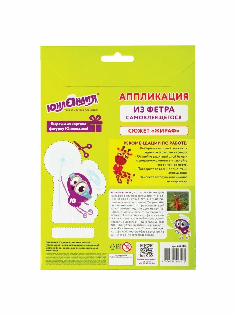 В набор входит яркая картонная основа в форме жирафа размером не более 20х15 см с напечатанным дизайном аппликации, разработанным дизайнерами ЮНЛАНДИЯ специально для детей, а также 8 листов фетра разных цветов. Фетровые элементы аппликации перфорированы и имеют клеевой слой, что позволяет создать аппликацию без клея и ножниц. Также в набор входит картонная подставка с клеевым слоем, на которую можно установить готовую аппликацию.