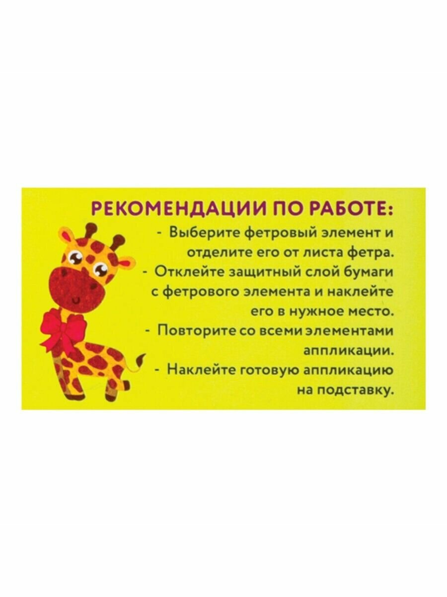 Аппликация из фетра ЮНЛАНДИЯ "Жираф" - это весёлый и занимательный способ развития мелкой моторики, аккуратности и фантазии ребёнка. Все элементы в составе самоклеящиеся, для работы не требуются ножницы и клей.