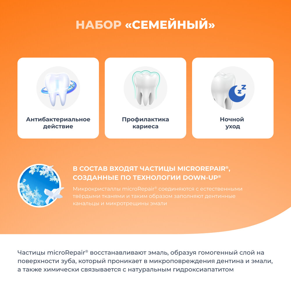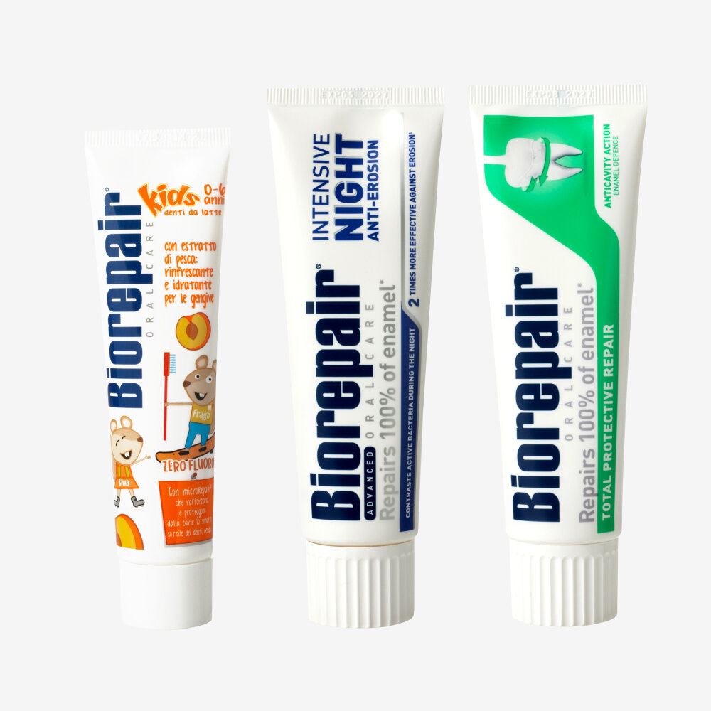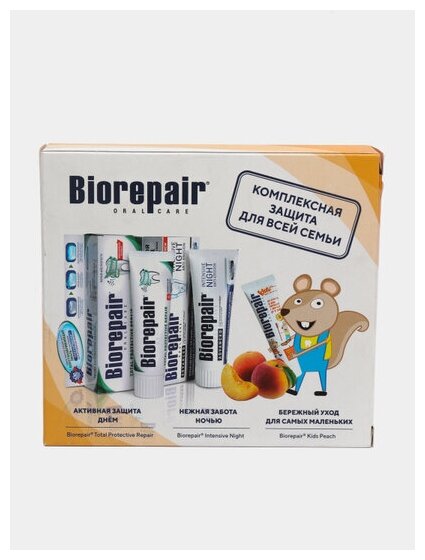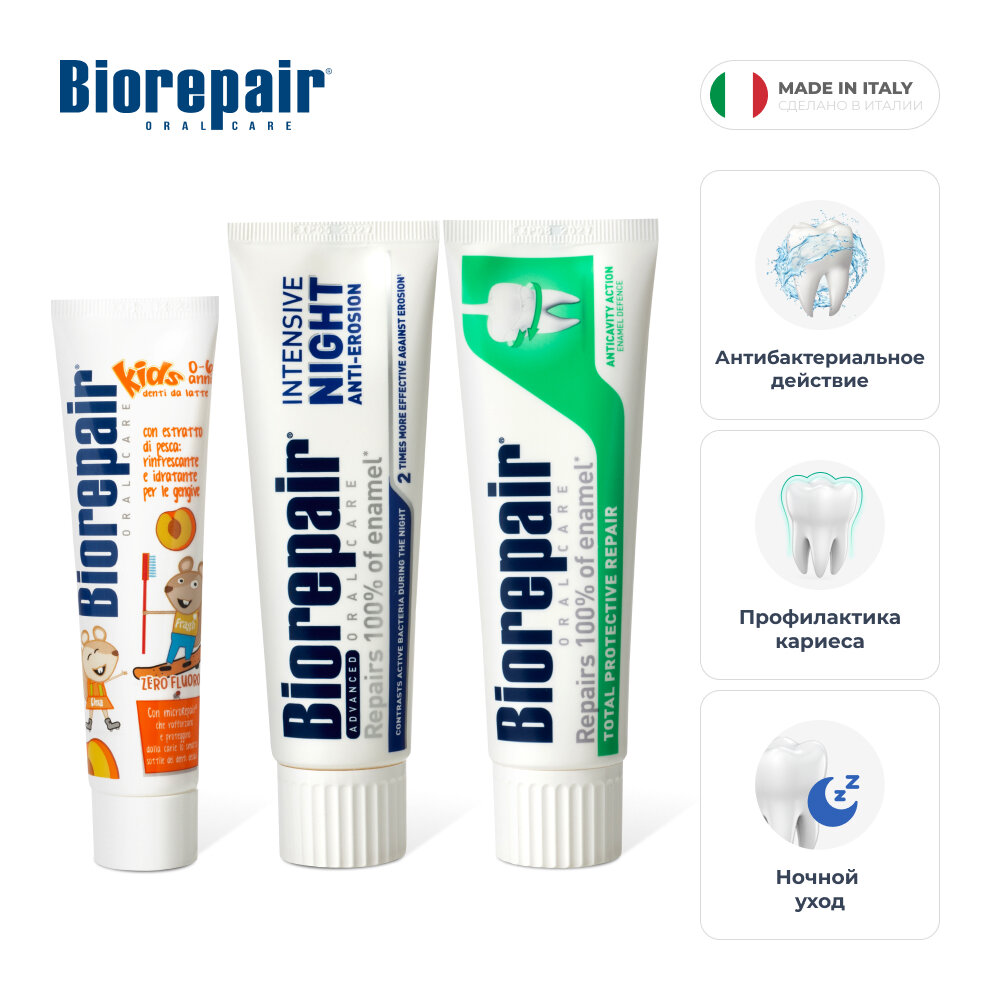 | Состав набора | зубная паста Total Protective Repair, 75 мл; ночная паста Intensivo Notte Repair, 75 мл; зубная паста Kids, детская, с экстрактом персика, 50 мл |