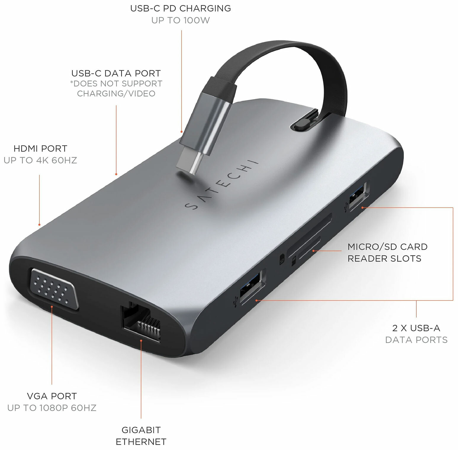 Удобный и порттивный адаптер оснащен зарядным устройством USB-C PD, портами HDMI и VGA, портами USB-A для передачи данных, слотами для карт SD и Gigabit Ethernet, а также двумя съемными кабелями USB-C. Идеально подходит для использования в дороге.