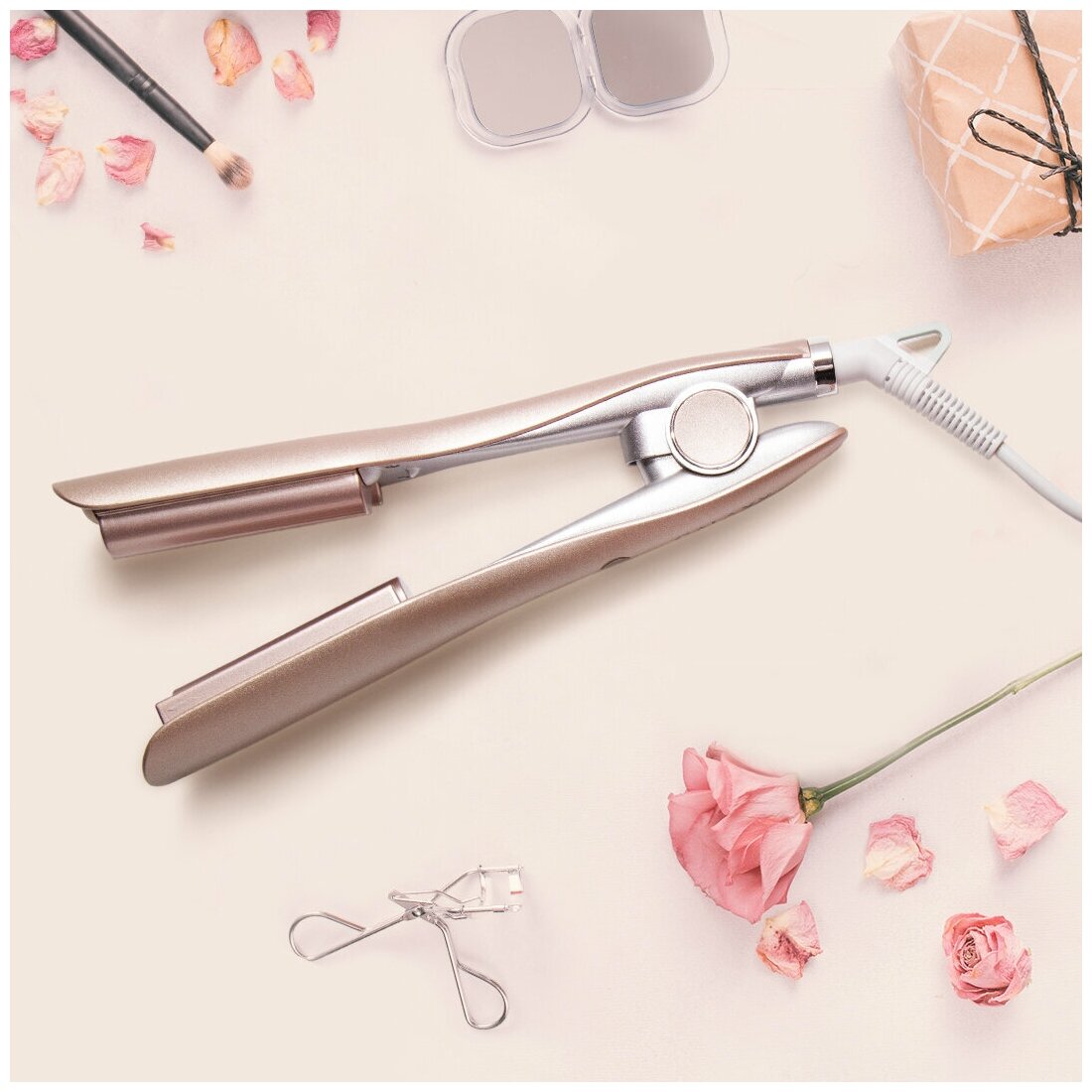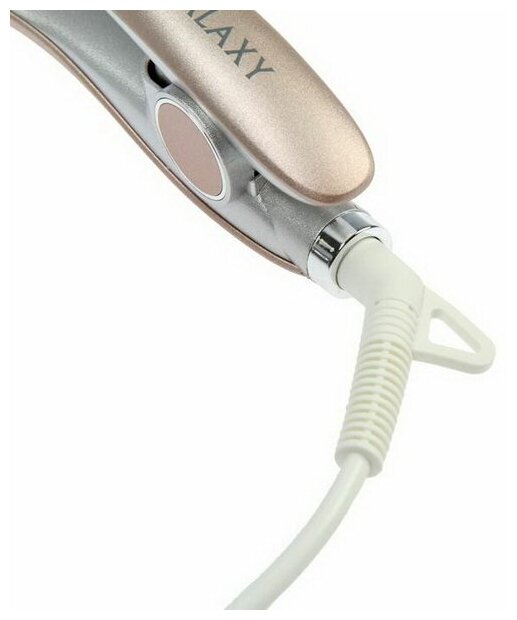 Стайлер Galaxy - это современный, удобный прибор для создания легких натуральных локонов в бытовых условиях. Инновационная форма пластин обеспечивает быструю завивку с эффектом "пляжных" локонов. Керамическое покрытие пластин стайлера хорошо распределяет температуру, не повреждает волосы и не перегревает их. Внутренняя влага не теряется, волосы не пересушиваются, выглядят здоровыми и блестящими. Очевидным преимуществом данной модели является наличие регулятора температуры от 140°С до 220°С. В зависимости от структуры и длины волос, а также особенностей укладки, Вы сможете регулировать температурный режим. Безопасное использование и долгий срок службы прибора обеспечивает нагревательный элемент с защитой от перегрева и наличие автоотключения через 1 час работы. Длины шнура питания - 1,8 м достаточно для комфортного использования стайлера. Стайлер плойка Galaxy оснащена подвесной петлей для компактного хранения в любом удобном месте. Позвольте себе идеальную современную укладку с техникой Galaxy!