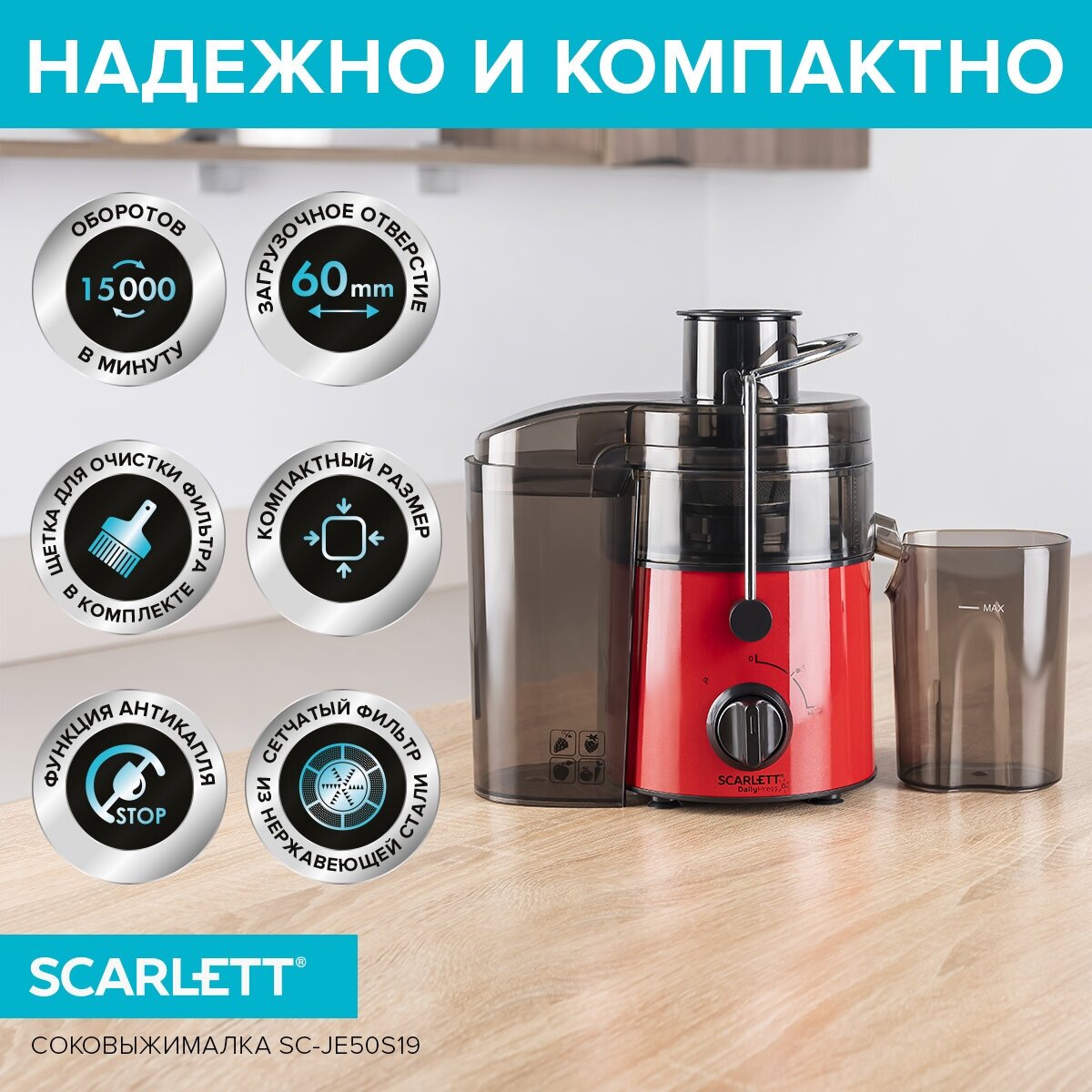 | Прочие особенности и свойства | Соковыжималка Scarlett SC-JE50S19 выполнена в компактном размере, что позволяет ей занимать места на кухне не больше, чем чайник. Долговечный сетчатый фильтр из нержавеющей стали позволит соковыжималке прослужить долго и качественно. Функция антикапля, металлический корпус и лёгкая сборка. |