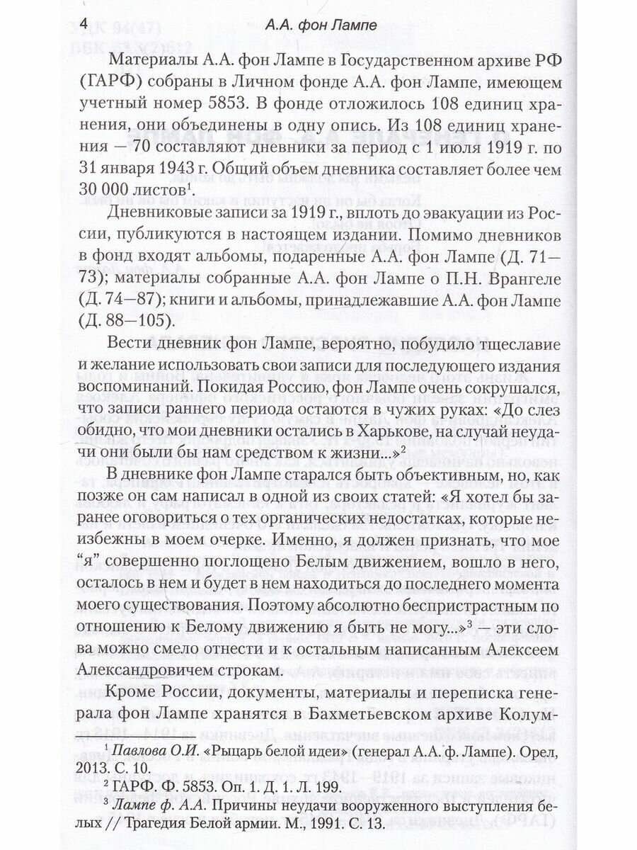 В дневнике Лампе описывается на удивление много повседневных дел и переживаний, рассуждений. В нем есть вставки разных официальных документов, но это, прежде всего, записи почти частного человека, и этим они и ценны. «Пути верных» — это добротный, хоть и субъективный очерк Гражданской войны. В нем, в частности, Лампе отрицает еврейские погромы, устраиваемые белыми. Очень слабо объяснены причины поражения последних, а основные даже не названы. Но видно, как приятно было Лампе по прошествии десятилетий (и каких десятилетий!) вспоминать прошлое. Лучше во всей книге – это несколько очерков о Лейб-гвардии Семеновском полке, посвященных общению автора с Николаем II, прекрасно написанных.