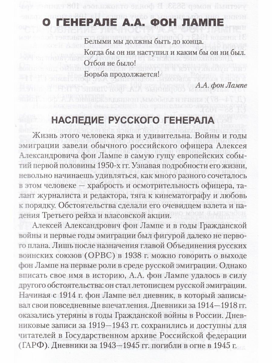 Жизнь этого человека ярка и удивительна. Войны и годы эмиграции завели обычного российского офицера Алексея Александровича фон Лампе в самую гущу европейских событий первой половины 1950-х гг. Узнавая подробности его жизни, невольно начинаешь удивляться, как много разного сочеталось в этом человеке – храбрость и осмотрительность офицера, талант журналиста и редактора, тяга к кинематографу и любовь к порядку. Обстоятельства сделали его очевидцем взлета и падения Третьего рейха и власовской акции.